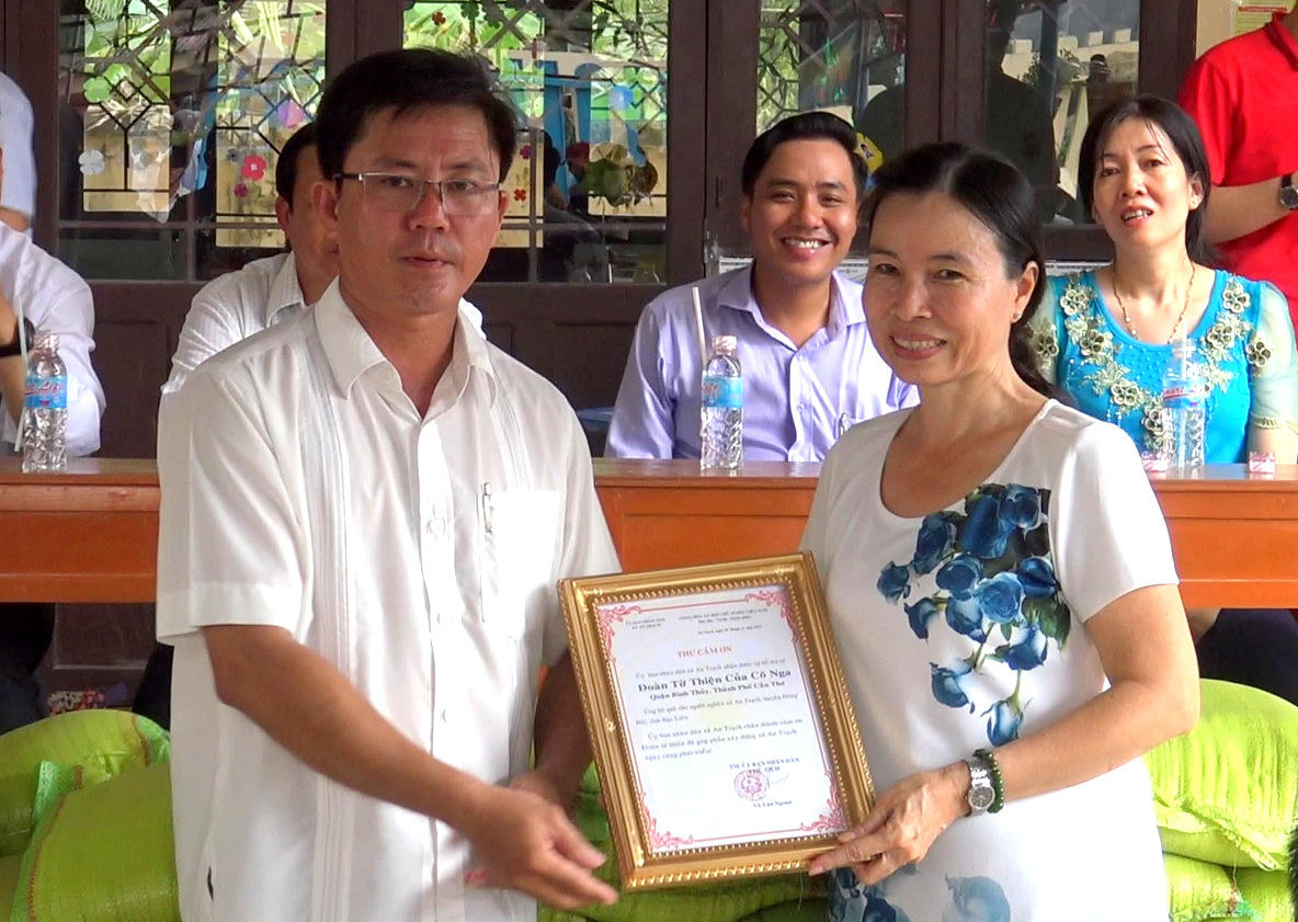 | Ông Võ Văn Ngoan, Chủ tịch UBND xã An Trạch trao thư cảm ơn cho đoàn từ thiện của cô Nguyễn Thị Nga. |