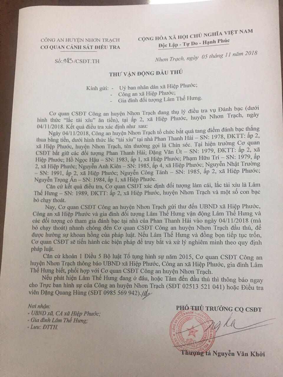 Nay, Cơ quan CSĐT Công an huyện Nhơn Trạch gửi “Thư vận động đầu thú” để các đối tượng bỏ trốn trên ra đầu thú. Cụ thể, cơ quan CSĐTcông an huyện đã gửi thư đến UBND xã Hiệp Phước, Công an xã Hiệp Phước và gia đình Lâm Thế Hưng nhằm vận động Lâm Thế Hưng và đồng bọn đang lẩn trốn sớm ra đầu thú trước pháp luật.