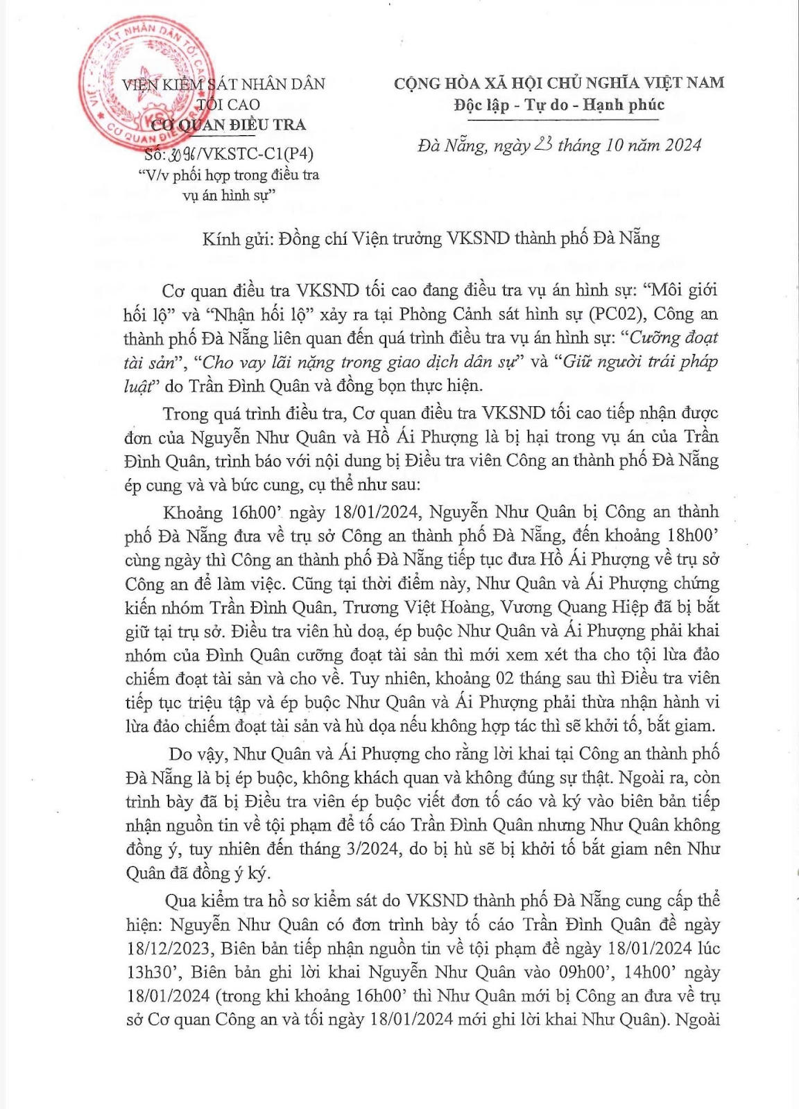 Trong văn bản đính kèm văn bản phúc đáp công văn của Báo, Viện Kiểm sát nhân dân tối cao (VKSNDTC) đã gửi kèm Văn bản số 3096/VKSTC-C1(P4) ngày 23/10/2024 mà cơ quan này gửi đến Viện trưởng VKSND thành phố Đà Nẵng. Cơ quan này cho biết: trong quá trình điều tra vụ án hình sự “Môi giới hối lộ” và “Nhận hối lộ” xảy ra tại Phòng Cảnh sát hình sự (PC02), Công an thành phố Đà Nẵng, có thấy liên quan đến quá trình điều tra vụ án hình sự “Cưỡng đoạt tài sản”, “Cho vay lãi nặng trong giao dịch dân sự” và “Giữ người trái pháp luật” do Trần Đình Quân và đồng bọn thực hiện.