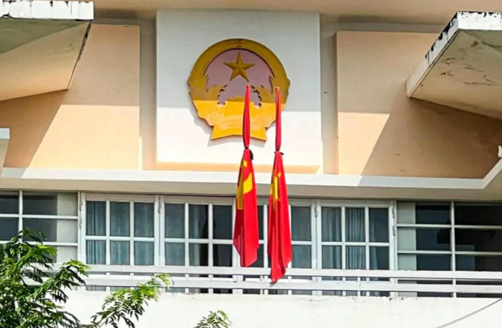 Hình ảnh lá cờ Tổ quốc được gắn dải băng đen tại trụ sở UBND Quận 8, TP HCM (Ảnh: VTC News)