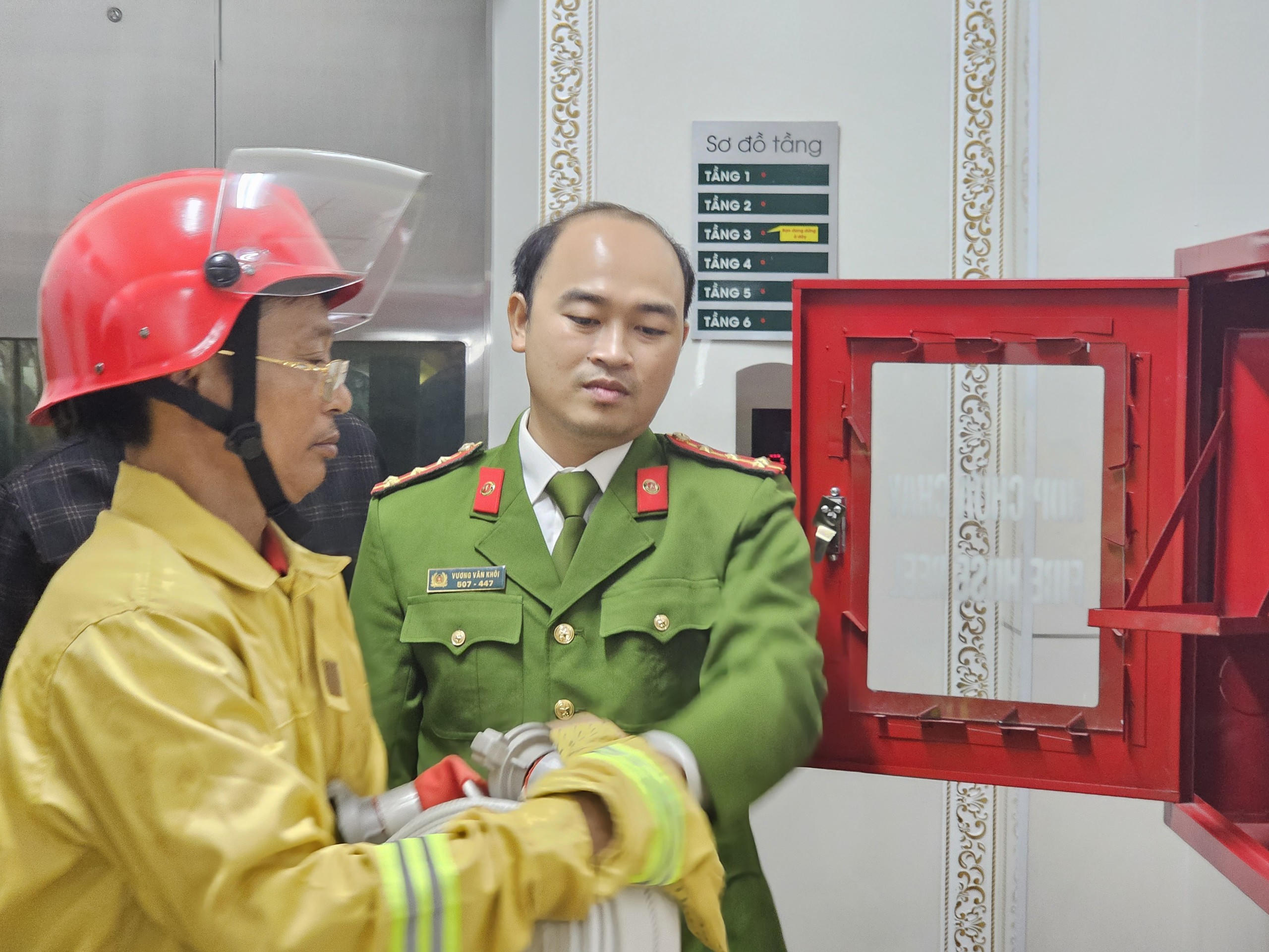 Cuối buổi tập huấn, Đại úy Vương Văn Khôi cùng toàn thể cán bộ, công nhân viên Bệnh viện Mắt Hồng Sơn đã trực tiếp đi kiểm tra hệ thống PCCC của bệnh viện, từ đó trực tiếp hướng dẫn một số biện pháp PCCC tại các khu vực trong bệnh viện.