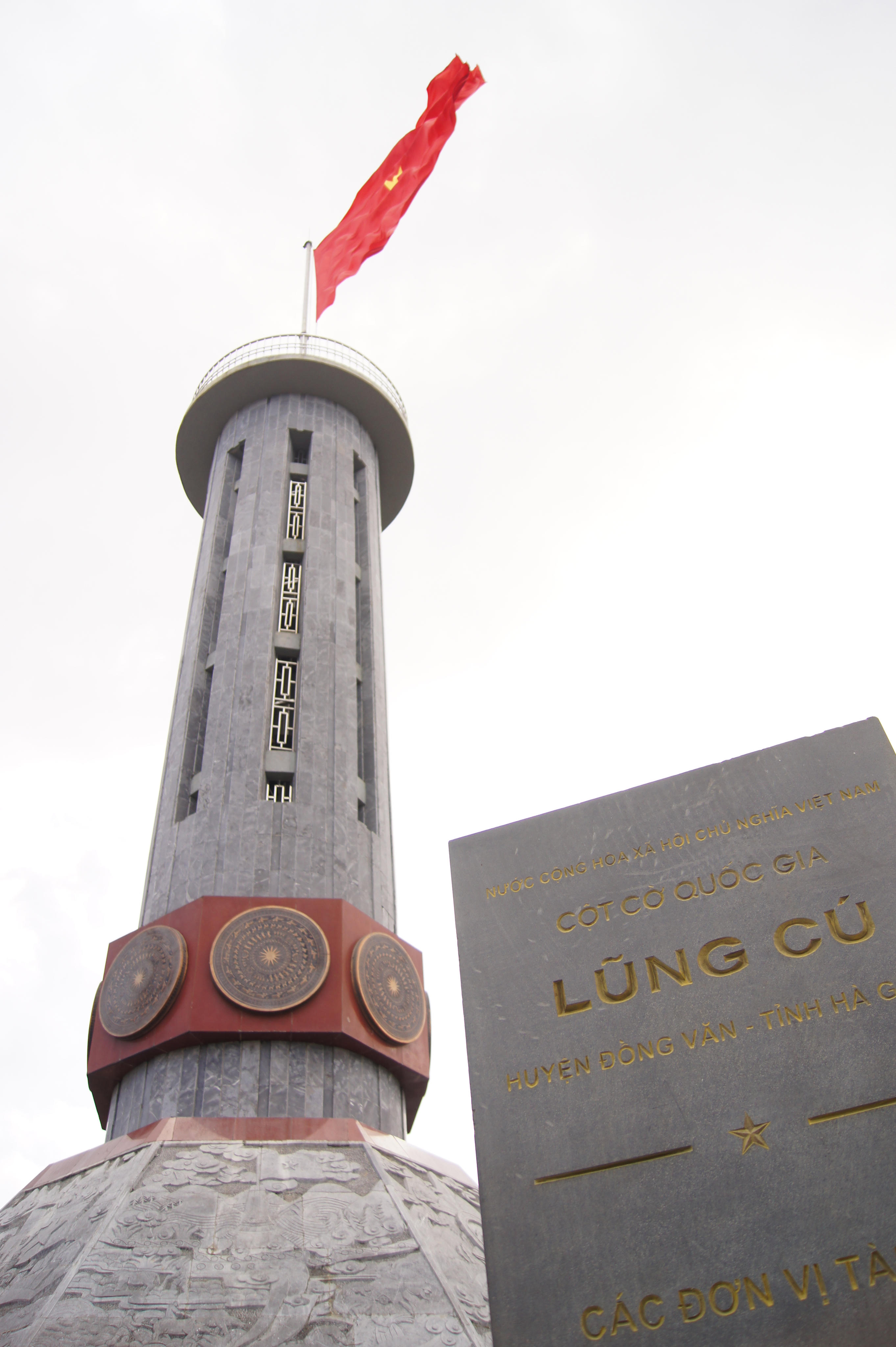 Cột cờ quốc gia Lũng Cú nằm trên đỉnh núi Rồng thuộc xã Lũng Cú, huyện Đồng Văn, tỉnh Hà Giang. Nằm gần cực Bắc của Tổ quốc, chân và bệ cột cờ hiện nay có 8 mặt phù điêu bằng đá xanh, trong đó của hoa văn mô phỏng mặt trống đồng Đồng Sơn. Đại kỳ có chiều dài 9m, rộng 6m, diện tích rộng 54m2, tượng trưng cho 54 dân tộc. (Ảnh: Hoàng Giang)