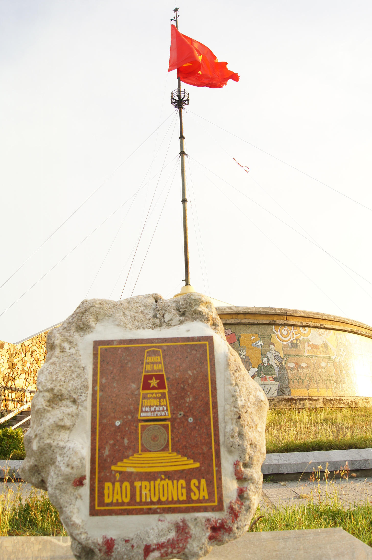 Cột cờ Hiền Lương (tỉnh Quảng Trị) là công trình trọng điểm nhất của cụm di tích đôi bờ Hiền Lương - sông Bến Hải - vĩ tuyến 17. Cột cờ Tổ quốc nơi đây là biểu tượng của niềm tin, ý chí và sức mạnh, sự thống nhất non sông của dân tộc Việt Nam. Điểm đặc biệt dưới chân cột cờ là những viên đá chủ quyền, khắc tên các hòn đảo chính ở Trường Sa, như lời hứa sắt son quyết gìn giữ non sông. (Ảnh: Hoàng Giang)