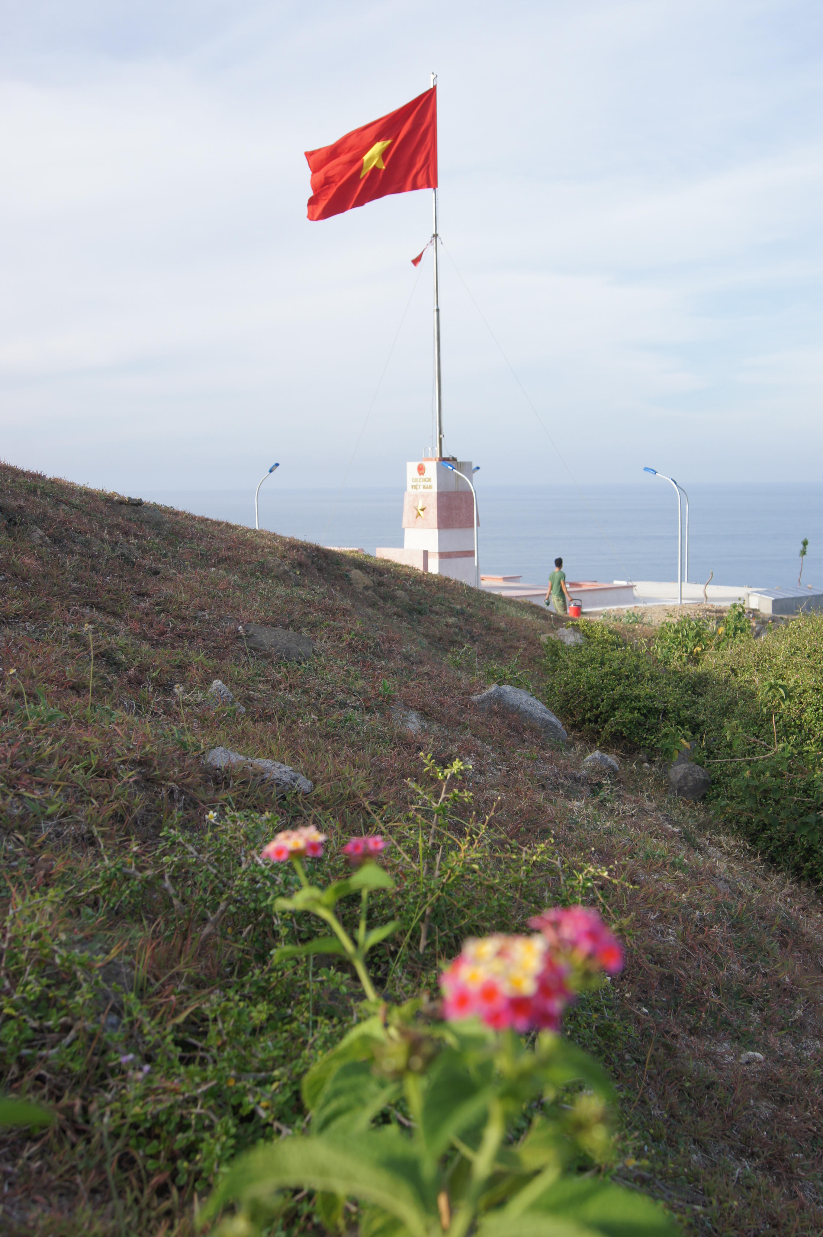 Đảo Phú Quý (tỉnh Bình Thuận) được ví như trạm nổi để phục vụ cho quốc phòng - an ninh, là điểm giao thoa giữa đất liền và quần đảo Trường Sa thân yêu, Nhà giàn DK1. Đây là đảo có vị trí rất quan trọng về quốc phòng - an ninh, bảo vệ tuyệt đối các mục tiêu trọng yếu. Cột cờ chủ quyền Tổ quốc tại đảo được khởi công xây dựng vào tháng 6/2015 tại mỏm Đông đồi Chuối, phía dưới là bãi biển Gành Hang. (Ảnh: Duy Khương)