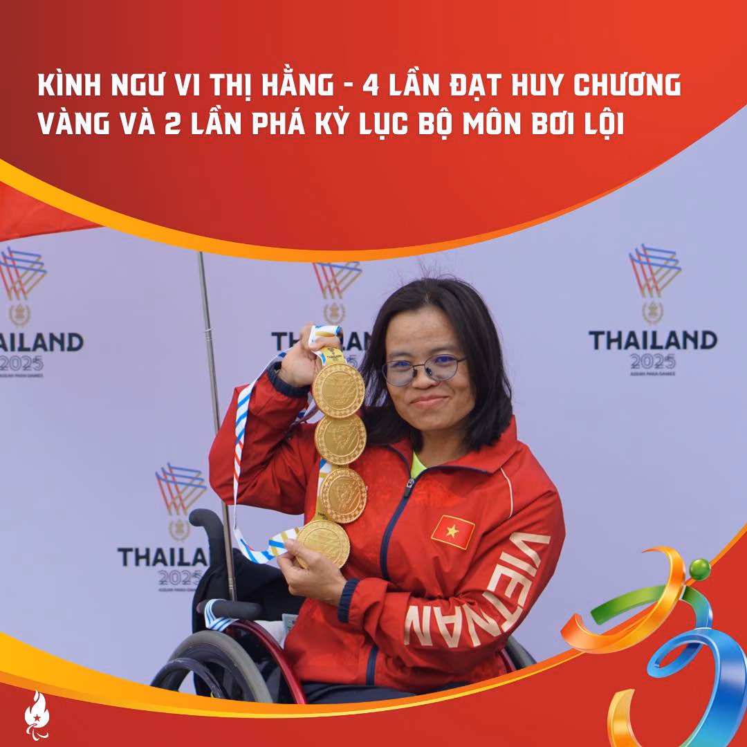 Nổi bật nhất trong đội hình bơi lội là Vi Thị Hằng – “cô gái vàng” của Bơi Người khuyết tật Việt Nam. Nữ “kình ngư” 36 tuổi thi đấu xuất sắc khi giành 4 HCV, đồng thời 2 lần phá kỷ lục Đại hội, trở thành một trong những VĐV thành công nhất của Đoàn Thể thao Người khuyết tật Việt Nam tại ASEAN Para Games 13. Một cái tên khác, Võ Huỳnh Anh Khoa cũng để lại dấu ấn mạnh mẽ với 3 HCV và 1 HCB, cho thấy sự trưởng thành vượt bậc cả về chuyên môn lẫn bản lĩnh thi đấu.