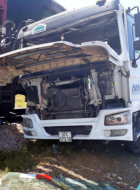 Cú đâm mạnh khiến chiếc xe bồn BKS 37C 17316 văng xa, xoay nằm dọc đường sắt, phần đầu bị hư hỏng, rất may đã không có thương vong về người.