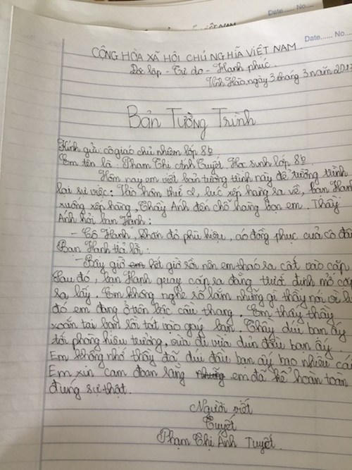 Chị Nguyễn Thị Bích Đào, vợ anh Trường cho biết đã bảo con kể tường tận, thậm chí viết tường trình. Theo đó, lúc 11 giờ 10 phút ngày 27.2, khi đã hết tiết 5 và tan trường, do áo đồng phục bị bẩn nên Hạnh cởi cùng khăn quàng đỏ và cất vào cặp rồi về. Đến cầu thang thì thầy giáo Phạm Hồng Ánh, Tổng phụ trách đội, đồng thời là giáo viên thể dục hỏi: “Cô Hạnh, khăn đỏ, phù hiệu với áo đồng phục đâu?”. Được giải thích đã cất trong cặp và định mở lấy ra mặc lại nhưng Hạnh vẫn bị thầy Ánh xoắn tai, tát 2 cái vào gáy rồi túm cổ dẫn lên phòng hiệu trưởng.