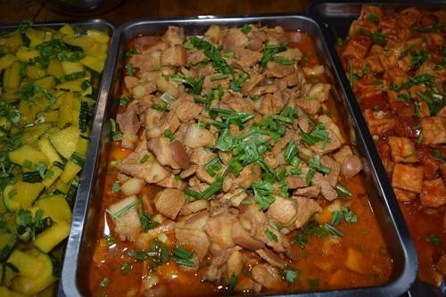 Sau khi nấu, những chiếc khay nhôm được xếp ra, các bạn lần lượt cho các món rau xào, thịt kho, đậu sốt cà chua, canh bầu nấu tôm, cắt dưa hấu sắp gọn gàng vào khay. Trong quán đã có một số bệnh nhân đến sớm ngồi đợi vì sợ chỉ ra muộn một chút sẽ không mua được.
