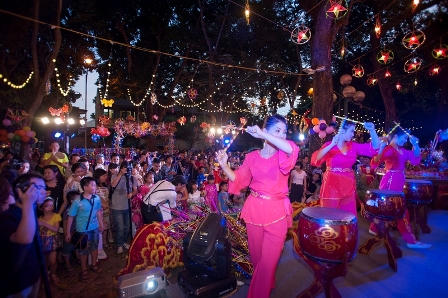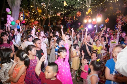 Dưới những hàng sấu cổ thụ, đèn lồng và đèn ông sao được thắp lên bởi bàn tay những nghệ nhân dân gian. Nghệ nhân làng vòng vừa nhanh tay đảo cốm trong chảo vừa kể chuyện với đám trẻ con về nghề làm cốm ở làng. Những cô bé, cậu bé thích thú chìa tay đón mẻ cốm non vừa giã rồi nhấm nháp trong niềm hạnh phúc bởi phát hiện ra vị cốm ngậy hương và ngọt ngào hơn hẳn. Cách đó không xa, nghệ nhân nặn tò he đang được vây quanh bởi đám đông trẻ nhỏ, một tay ông nặn tò he, một tay chỉ dẫn bọn trẻ cách nặn những con vật đơn giản. Háo hức nhất vẫn là các em nhỏ khi được tham gia bày mâm ngũ quả, dạo qua khu chợ Trung thu để học cách nặn tò he, làm đèn lồng hay làm bánh nướng, bánh dẻo.