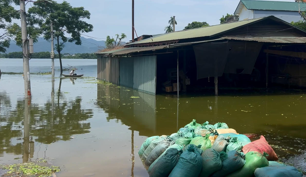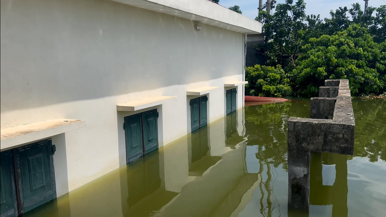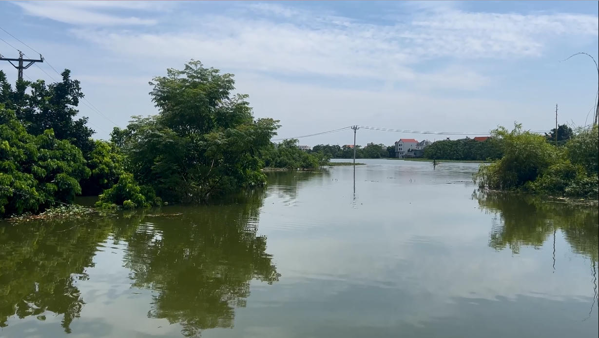 Tại thôn Trại Ro, xã Tuyết Nghĩa, huyện Quốc Oai, lũ rút dần, nhưng nhiều khu vực vẫn trong tình cảnh sống chung với nước. |