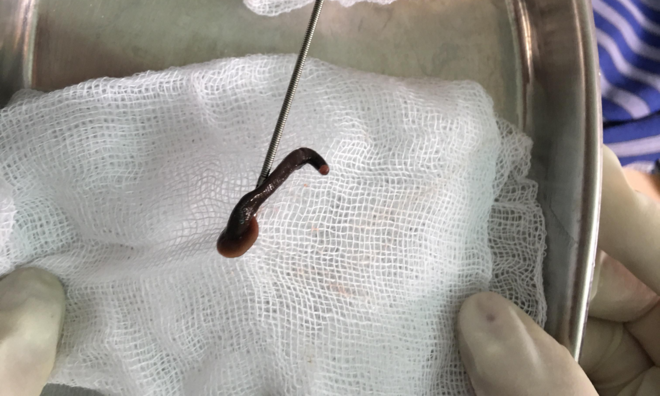 Con đỉa được gắp ra khỏi họng bệnh nhân. Ảnh:Bệnh viện cung cấp. |