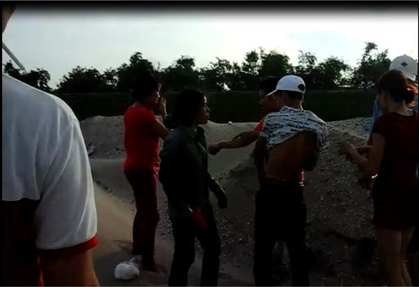 Đến khoảng 16h30 ngày 20/6, bất ngờ có khoảng gần 30 người lạ mặt, phần lớn là thanh niên xăm trổ xuất hiện. “Có 1 ô tô màu đen chở theo khoảng hơn 10 người tới lán của Cty Bình Dân trước. Sau đó có 1 ô tô Transit màu trắng BKS 34B 015.15 đỗ trên bờ đê. Nhiều người mang theo hung khí là những tuýp sắt dài”, một nhân chứng cho biết.