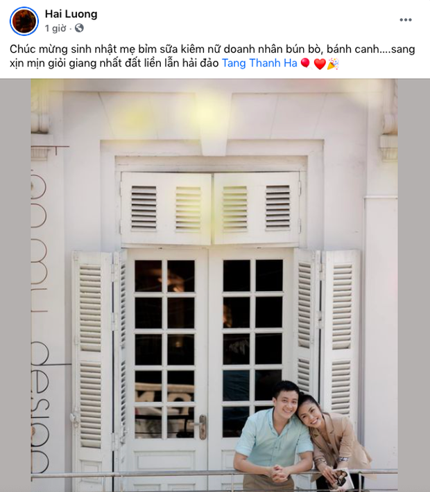 Trong bài viết, Lương Mạnh Hải còn công khai khen ngợi Hà Tăng là một phụ nữ giỏi giang, sang và xịn. "Chúc mừng sinh nhật mẹ bỉm kiêm nữ doanh nhân bún bò, bánh canh... sang xịn mịn giỏi giang nhất đất liền lẫn hải đảo Tăng Thanh Hà", anh viết.