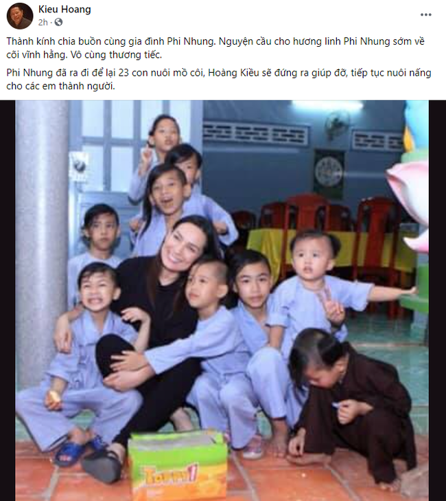Trên trang cá nhân vào tối 28/9, tỷ phú Hoàng Kiều viết lời tiễn biệt Phi Nhung: "Thành kính chia buồn cùng gia đình Phi Nhung. Nguyện cầu cho hương linh Phi Nhung sớm về cõi vĩnh hằng. Vô cùng thương tiếc".