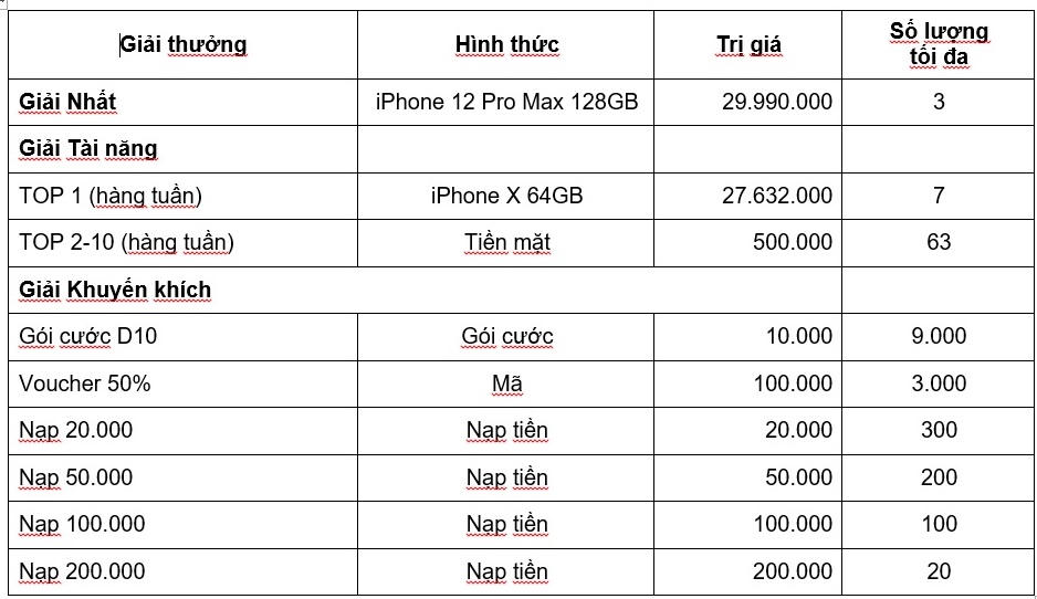 Tương ứng với mỗi giao dịch hợp lệ, thuê bao sẽ nhận được số lượt chơi bằng kết quả của phép chia (không lấy số dư) của [Số tiền giao dịch] cho giá trị [50.000đ]