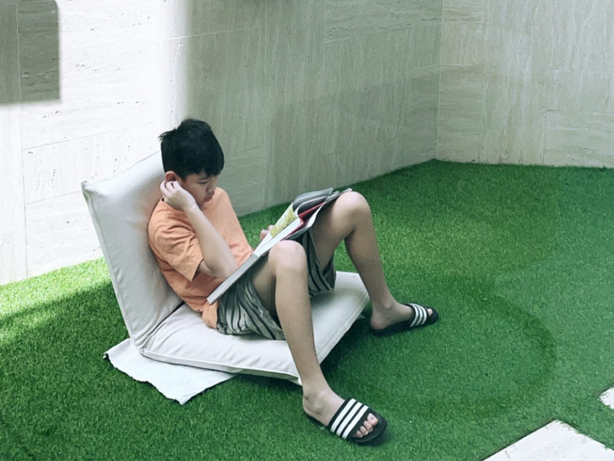 Ngay cả khi về nhà mẹ Hà dịp cuối tuần, cậu bé chăm chỉ đọc sách ở ngoài vườn. Hồ Ngọc Hà rất tự hào vì con trai biết ý thức học hành.