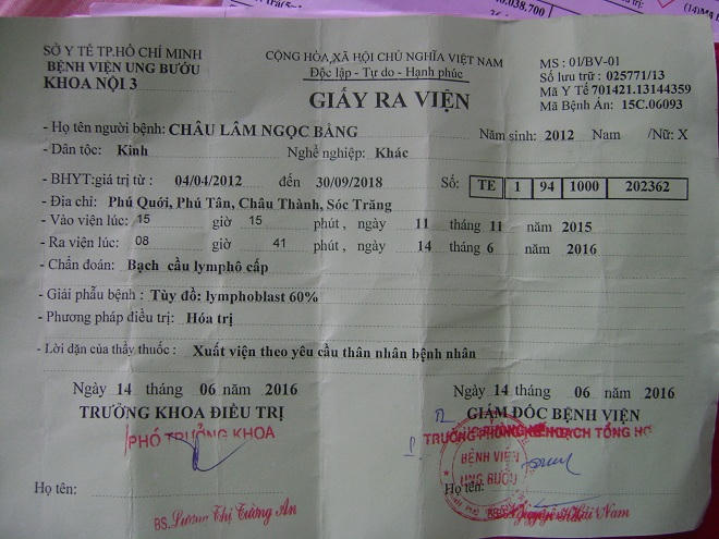Kể từ đó cháu Bằng phải nằm điều trị ở bệnh viện ung bướu TPHCM, ở bệnh viện nhiều hơn ở nhà ròng rã suốt hơn 3 năm liền, cháu Bằng luôn nhớ gia đình đòi về nhà. Được mẹ an ủi con không sao, khi nào hết bệnh rồi hai mẹ con cùng về, như được tăng thêm động lực của mẹ, bé Bằng vui mừng mau cho hết bệnh để được về với gia đình.