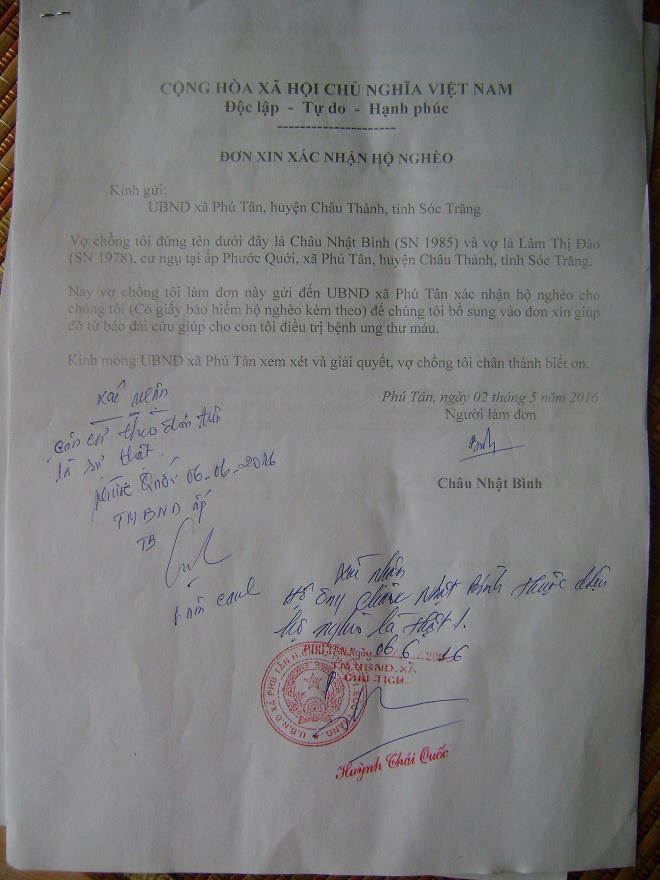 Ông Lâm Can - trưởng ban nhân dân ấp Phước Quới, xã Phú Tân cho biết “Gia đình anh Bình thuộc diện hộ nghèo và rất khó khăn lại phải gánh chịu nỗi đau khi con bị ung thư máu vừa qua đời, chúng tôi cũng vận động bà con giúp đỡ, nhưng cuộc sống của bà con ai cũng nghèo nhưng chỉ giúp được phần nào”.