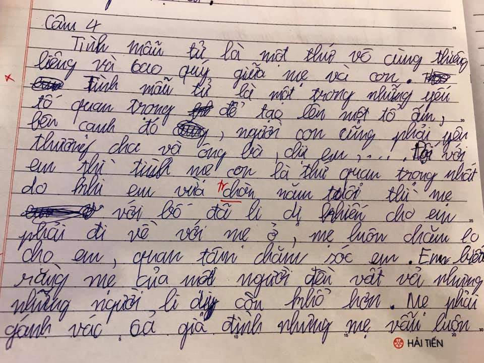 Mẹ em cũng đã ngoài 50, không thể kiếm nhiều tiền như trước nữa nhưng mẹ vẫn cố gắng đi làm, vì mẹ biết sau li dị thì người con luôn thiệt thòi nhiều nhất do thiếu sự quan tâm chăm sóc từ người bố hoặc người mẹ, nhưng cuối cùng thì với tình mẫu tử bao la của mẹ thì đã có thể thay thế được vị trí của hai người phụ huynh.