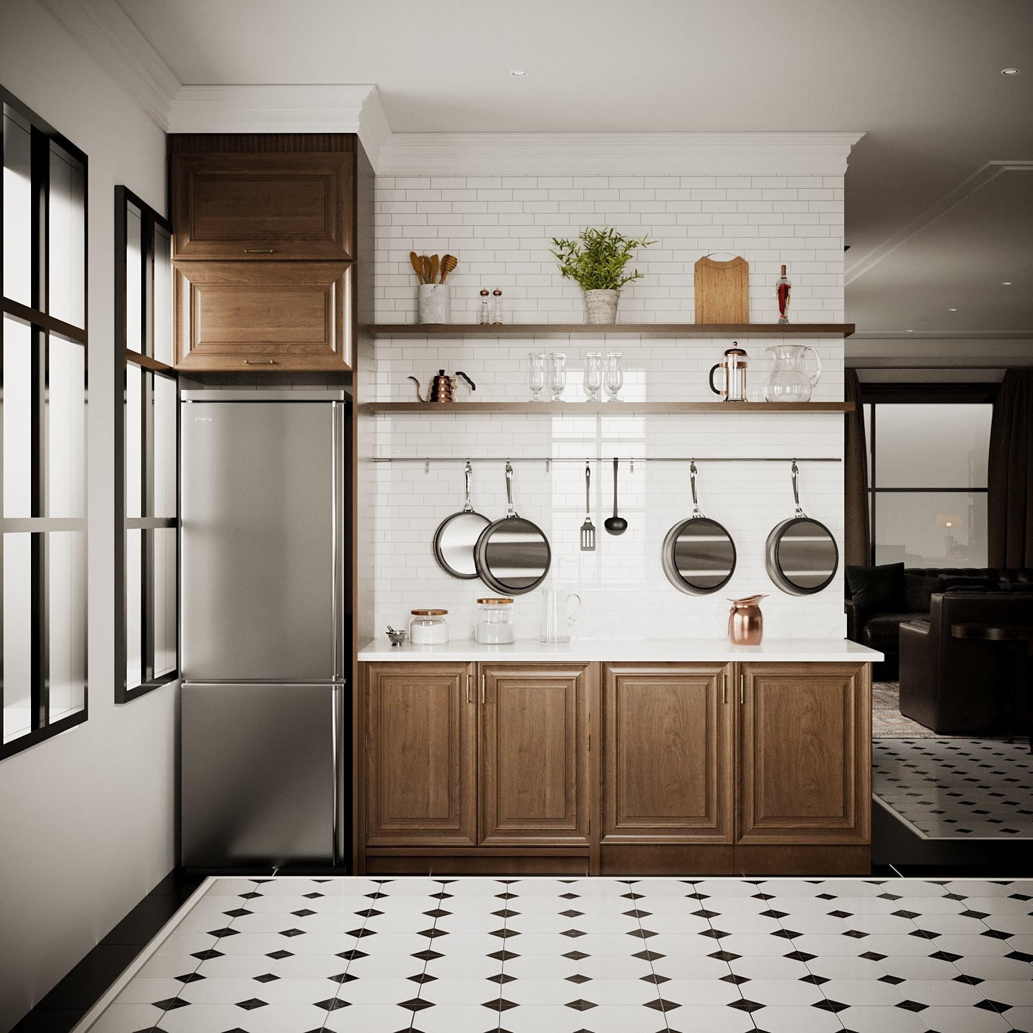 Nhà bếp không sử dụng gạch mà sử dụng sàn gỗ. Việc lựa chọn sàn gỗ giúp mang lại cảm giác ấm cúng và tự nhiên cho căn bếp. |