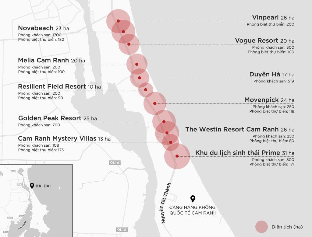 Tại phía nam Nha Trang là khu vực Cam Ranh cũng đang là đại công trường xây dựng hàng nghìn căn hộ condotel, biệt thự biển. Các dự án có điểm chung đều rộng hàng chục đến hàng trăm ha, chạy dọc bờ biển Bãi Dài Cam Ranh và hình thành những khu nghỉ dưỡng rộng lớn.