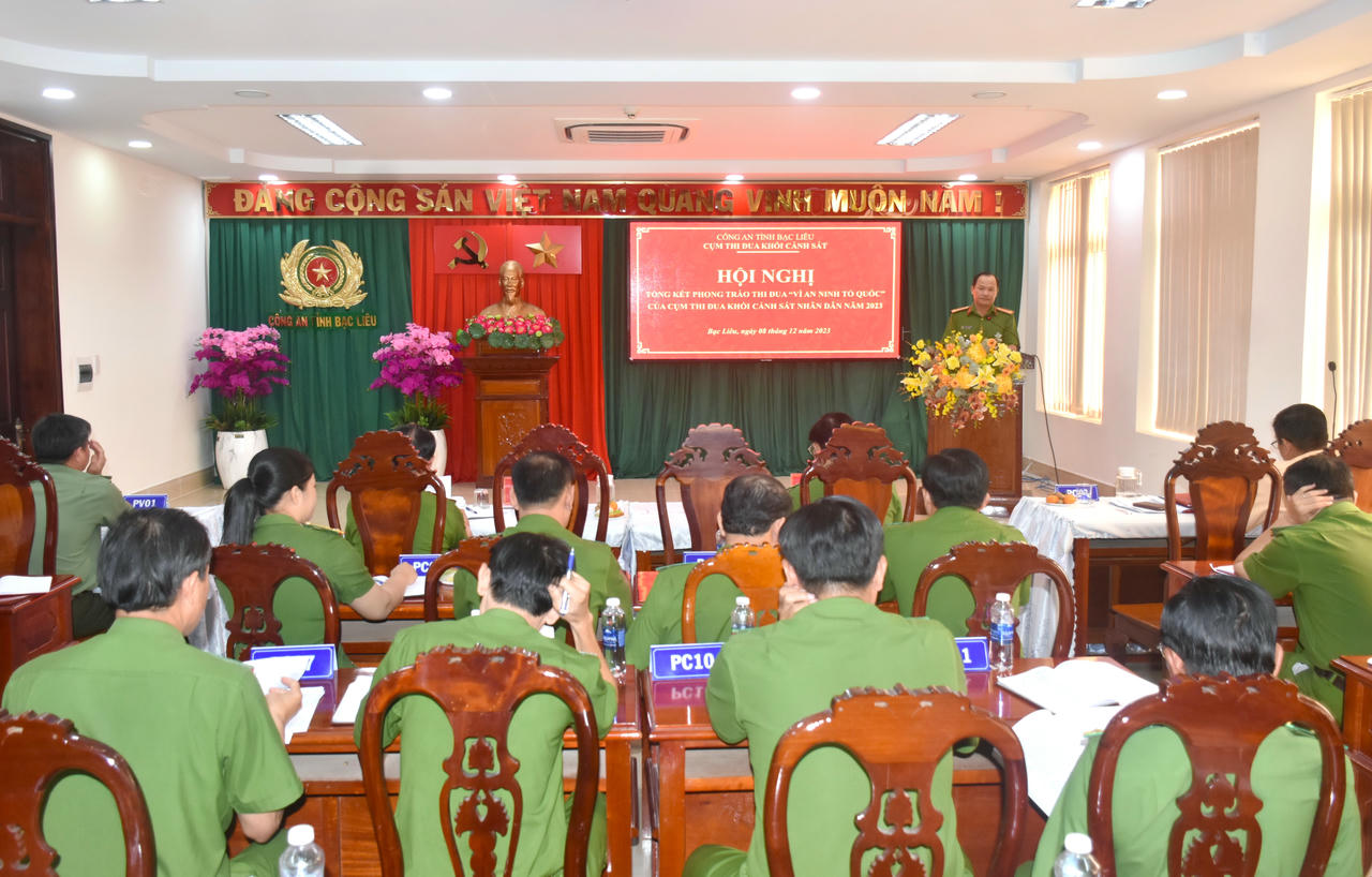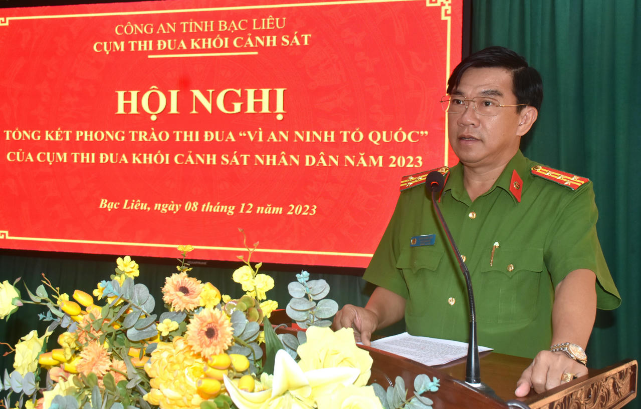 Phát biểu tại Hội nghị, Đại tá Châu Quốc Huy - Phó Giám đốc, Thủ trưởng Cơ quan Cảnh sát điều tra Công an tỉnh Bạc Liêu ghi nhận và biểu dương những thành tích mà Cụm thi đua khối Cảnh sát nhân dân đạt được thực hiện phong trào thi đua “Vì an ninh Tổ quốc” năm 2023. “Thời gian tới, các đơn vị trong Cụm thi đua khối Cảnh sát nhân dân cần xây dựng mối đoàn kết chặt chẽ, thống nhất giữa các đơn vị trong Cụm; thực hiện có hiệu quả công tác tham mưu Đảng ủy, Giám đốc Công an tỉnh trong bảo đảm ANTT; phát huy vai trò nòng cốt trong tham mưu cấp ủy, chính quyền các cấp giải quyết các vấn đề phức tạp phát sinh ngay từ cơ sở; bảo đảm ANTT, bảo vệ tuyệt đối an ninh, an toàn Tết Nguyên đán Giáp Thìn 2024.