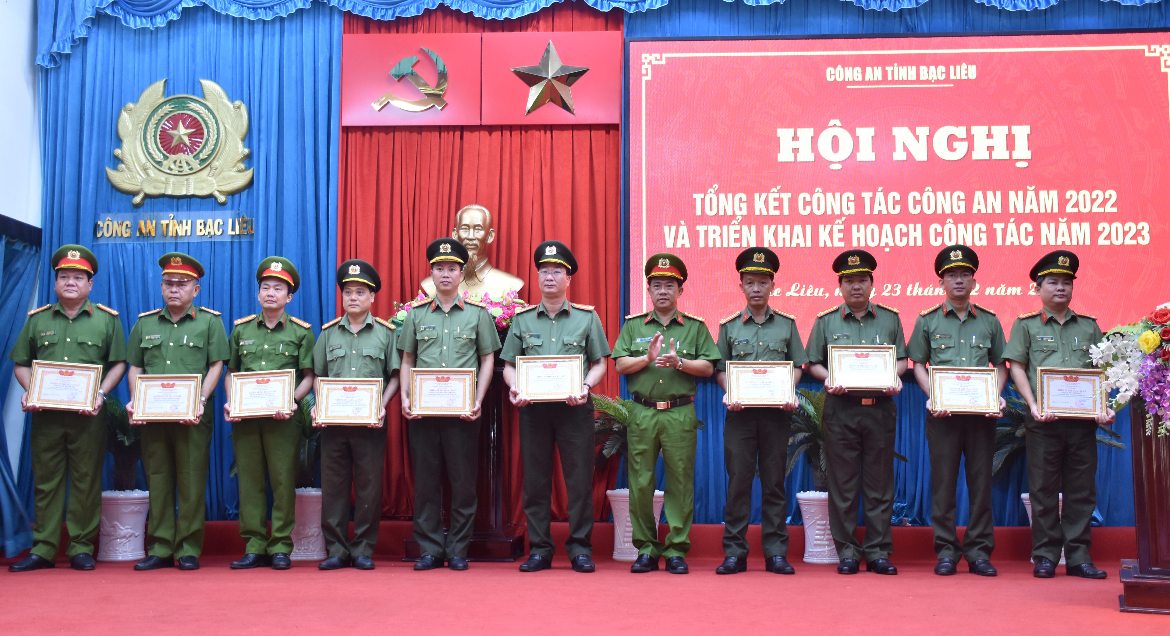 Đại tá Lê Việt Thắng - Giám đốc Công an tỉnh Bạc Liêu trao Cờ thi đua Bộ Công an cho các đơn vị có thành tích xuất sắc trong phong trào thi đua “Vì an ninh Tổ quốc” năm 2022. |