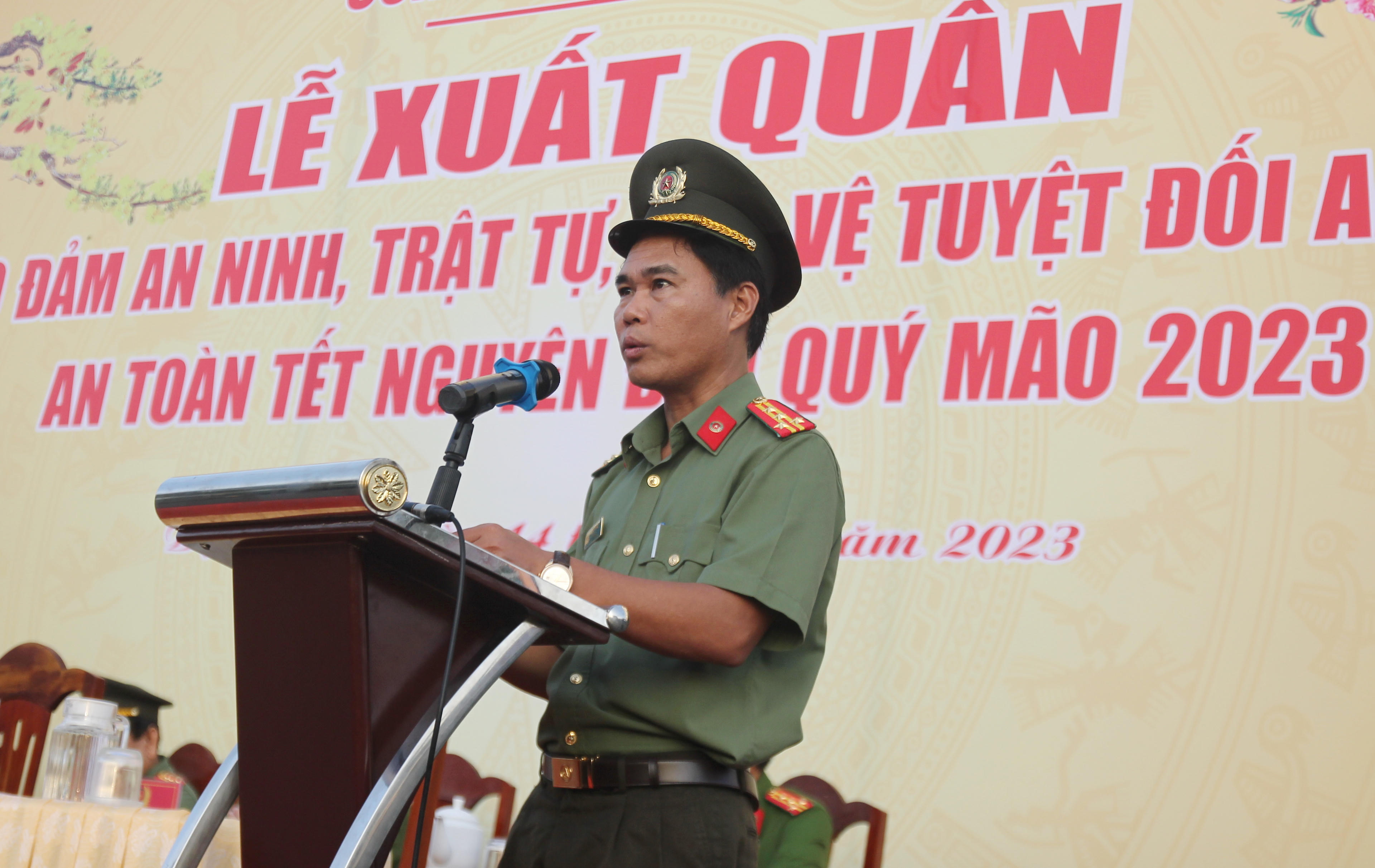 Theo Đại tá Lê Việt Thắng, chỉ còn ít ngày nữa là đến Tết nguyên đán Quý Mão 2023, lực lượng và phương tiện của Công an tỉnh luôn ở trạng thái sẵn sàng cao nhất, bảo vệ tuyệt đối an ninh, an toàn, không để xảy ra sự cố bất ngờ. Lễ Xuất quân, diễu hành thị uy lực lượng là để tạo cho lực lượng vũ trang, các cấp, ngành và toàn thể nhân dân khí thế tấn công, trấn áp tội phạm, bảo đảm an ninh, trật tự, bảo vệ tuyệt đối an toàn các sự kiện chính trị và Tết Nguyên đán Quý Mão 2023.