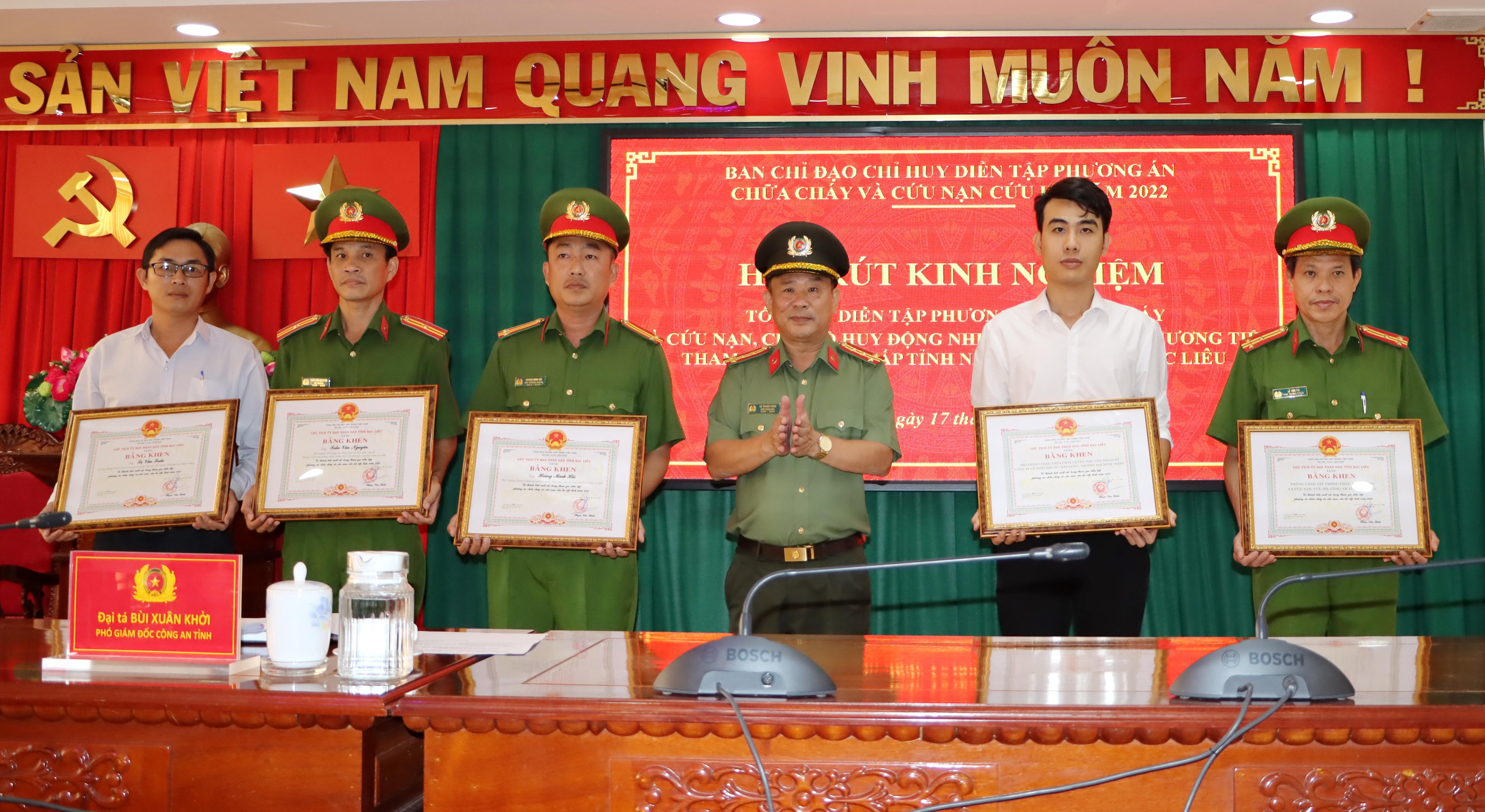 Đặc biệt, ghi nhận nỗ lực các lực lượng tham gia diễn tập, Chủ tịch UBND tỉnh Bạc Liêu tặng Bằng khen cho 02 tập thể, 03 cá nhân; Giám đốc Công an tỉnh Bạc Liêu tặng Giấy khen cho 06 tập thể, 10 cá nhân có thành tích xuất sắc trong tham gia Diễn tập phương án chữa cháy và cứu nạn, cứu hộ huy động nhiều lực lượng, phương tiện tham gia quy mô cấp tỉnh năm 2022.