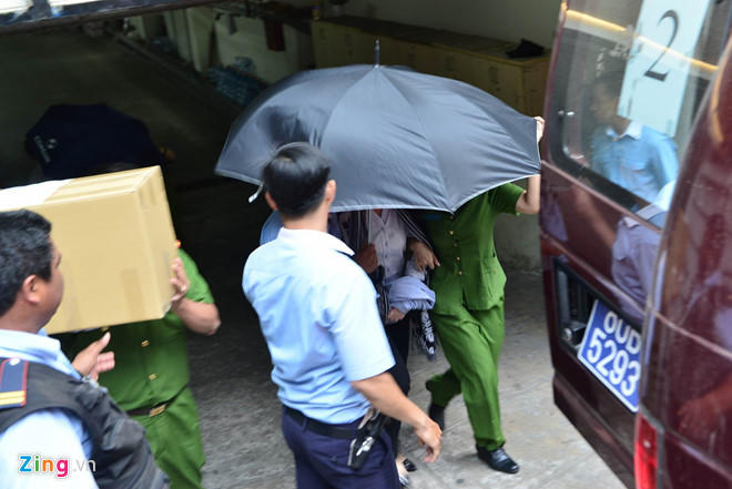 Thời điểm chuẩn bị lên xe, 2 người phụ nữ òa khóc lớn. Nhiều nhân viên Ngân hàng Eximbank chi nhánh TP.HCM dùng vải và dù che mặt 2 người phụ nữ trước hàng chục ống kính của phóng viên.