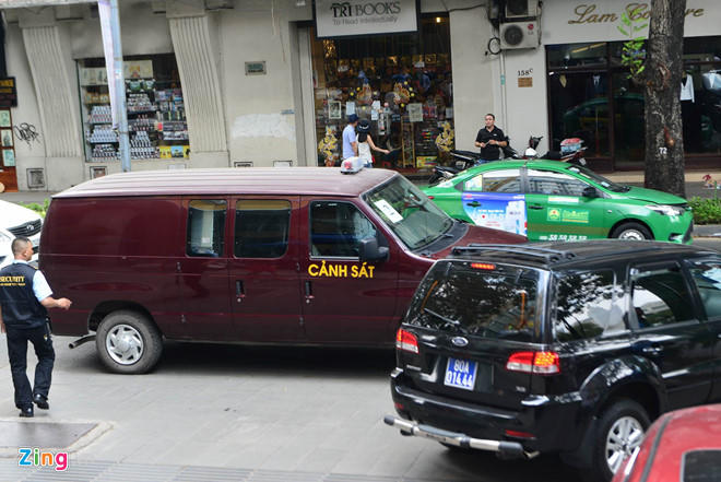 Đến 12h50, hai cán bộ của ngân hàng bị còng tay, che mặt, áp giải ra xe chuyên dụng cùng một số thùng chứa tài liệu thu thập được tại ngân hàng này.