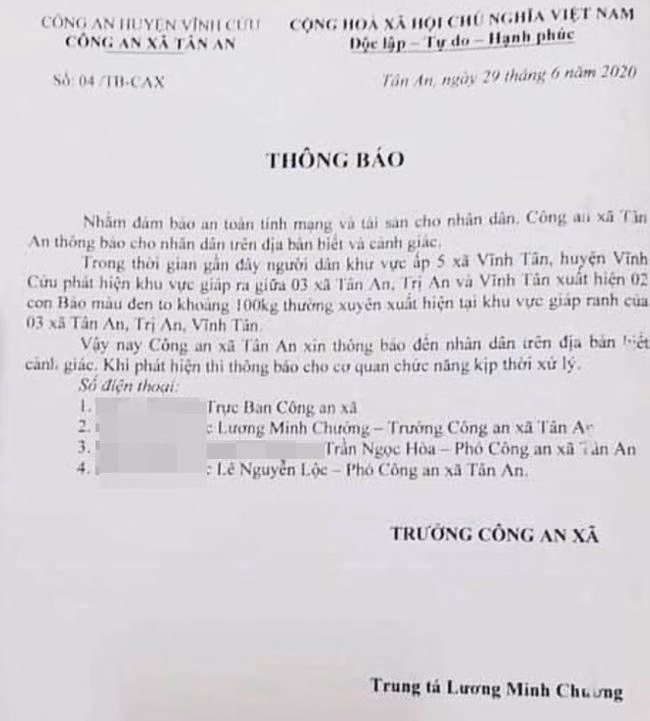Theo đó, tối 29/6, trên mạng xã hội xuất hiện một văn bản của Công an xã Tân An, huyện Vĩnh Cửu, tỉnh Đồng Nai thông báo việc người dân phát hiện 2 con báo màu đen to khoảng 100kg, thường xuất hiện ở giáp ranh 3 xã Tân An, Trị An, Vĩnh Tân của tỉnh Đồng Nai. Văn bản này nhận được khá nhiều bình luận chia sẻ….