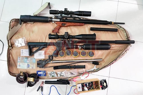 Tại nhà của Tuấn, lực lượng chức năng đã thu giữ được nhiều giấy tờ giả như CCCD, giấy phép lái xe, thẻ ngành Công an, 2 khẩu súng hơi bắn đạn chì.