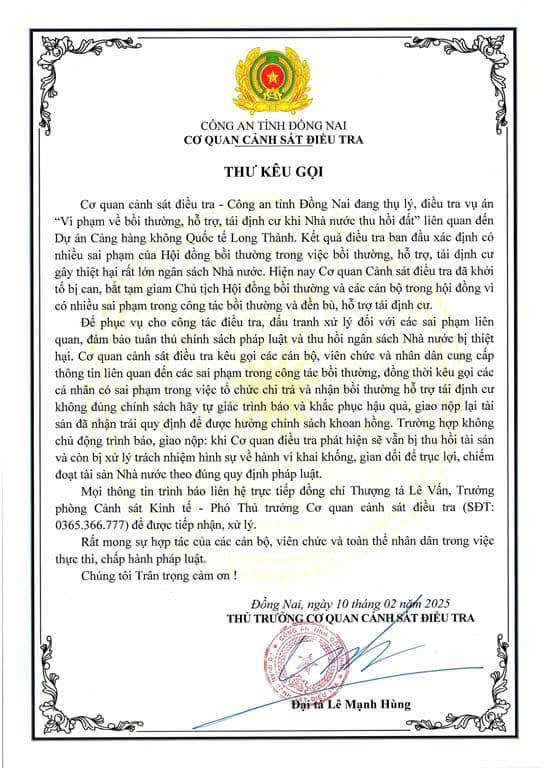 Đại tá Lê Mạnh Hùng, Phó giám đốc, Thủ trưởng Cơ quan Cảnh sát điều tra (CSĐT) - Công an tỉnh Đồng Nai đã ký phát hành thư kêu gọi các cán bộ, viên chức, nhân dân cung cấp các thông tin liên quan đến sai phạm của dự án Sân bay Long Thành.