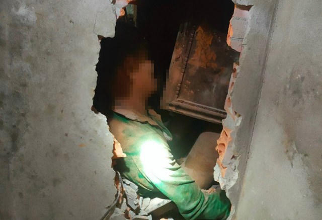 Lực lượng chức năng đục tường giải cứu thành công vợ chồng ông Minh. |