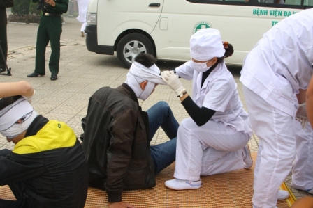 Cán bộ y tế tiến hành cấp cứu người bị thương, xử lý môi trường