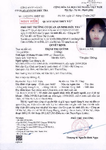 Tuy nhiên, trong quá trình điều tra, bị can không có mặt tại nơi cư trú. Do đó, ngày 23/12/2025, Cơ quan An ninh điều tra Công an thành phố Hà Nội đã ra quyết định truy nã đối với Trịnh Thị Quỳnh theo quy định của pháp luật.