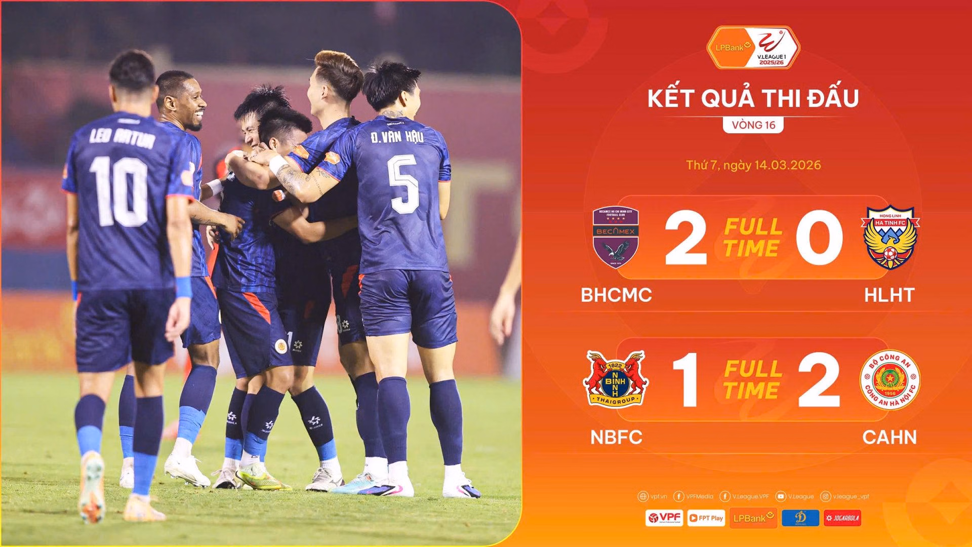 Trận đấu còn lại trong ngày 14/3, CLB Becamex TP.HCM giành trọn 3 điểm trước Hồng Lĩnh Hà Tĩnh bằng chiến thắng 2-0. Chiến thắng rất quý giá cho đội chủ nhà bởi với 3 điểm có được, đội bóng này gia tăng đáng kể khoảng cách điểm số với các đội xếp cuối, bắt nhịp được vào tốp giữa bảng xếp hạng.