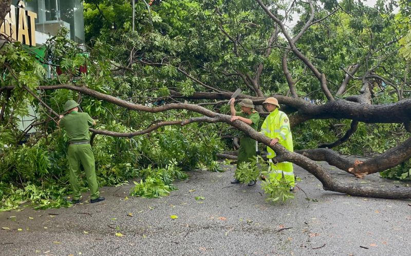 Lực lượng Công an tỉnh Vĩnh Phúc dọn dẹp các cây xanh bị đổ gãy do bão số 3.