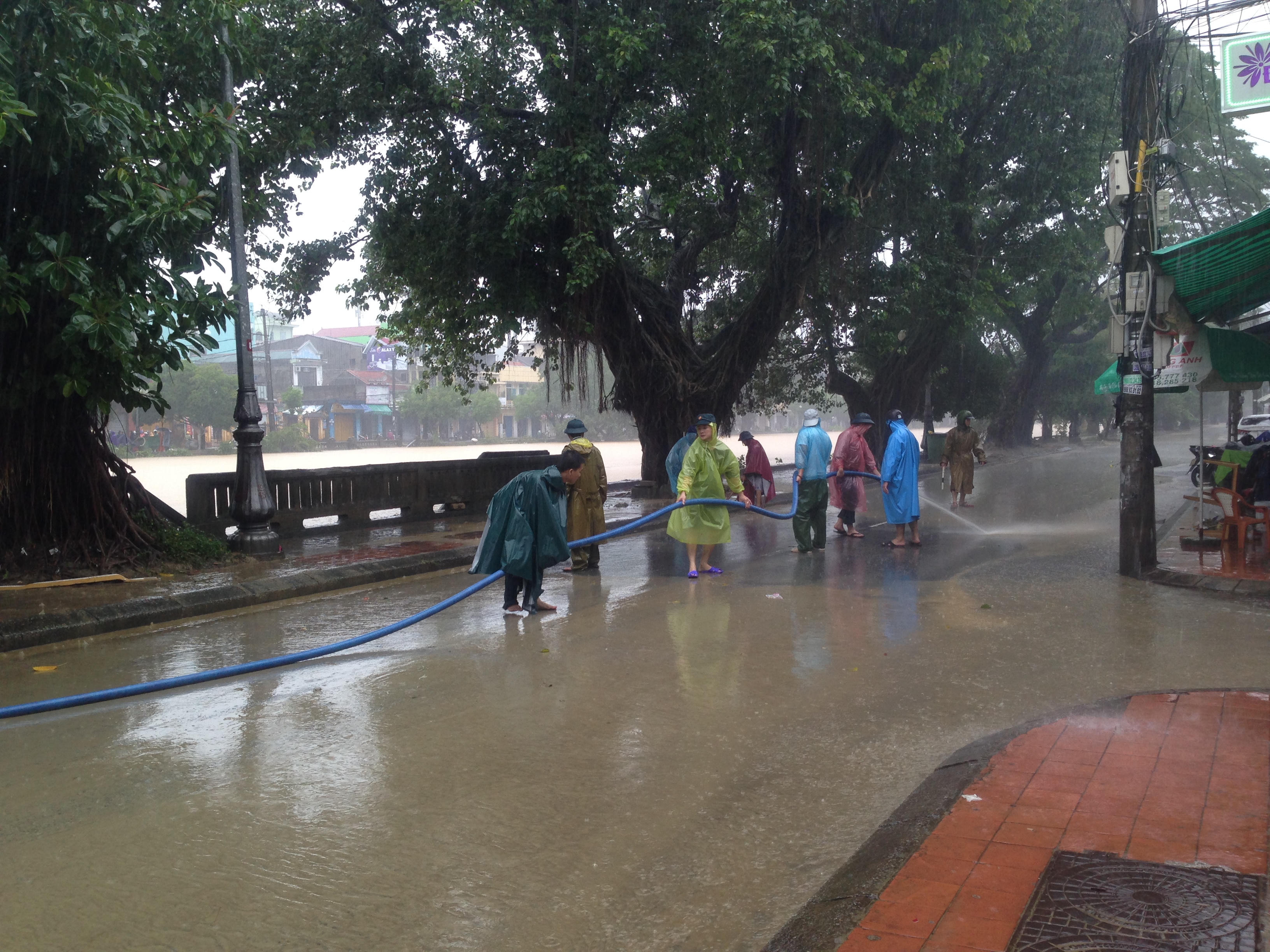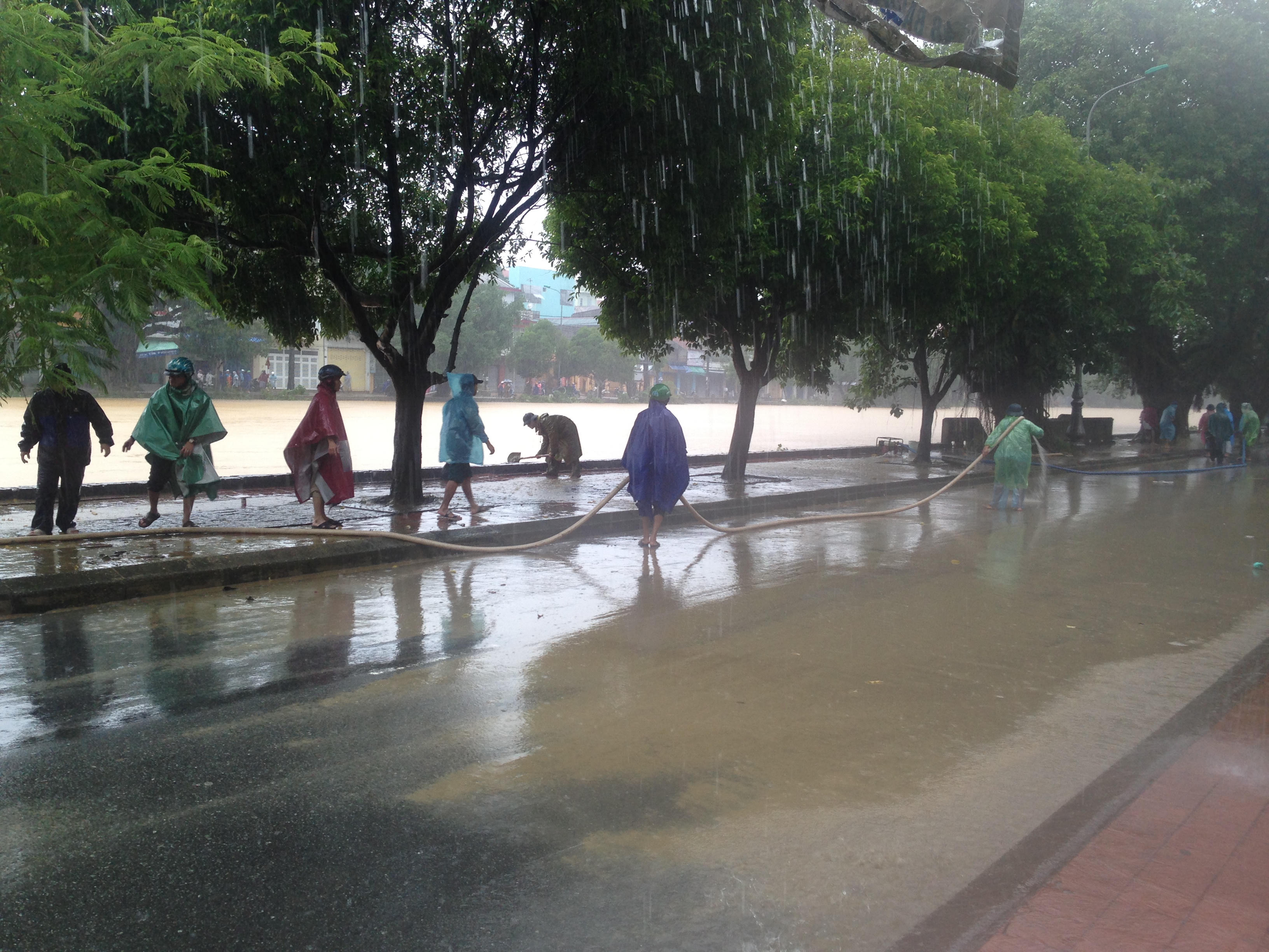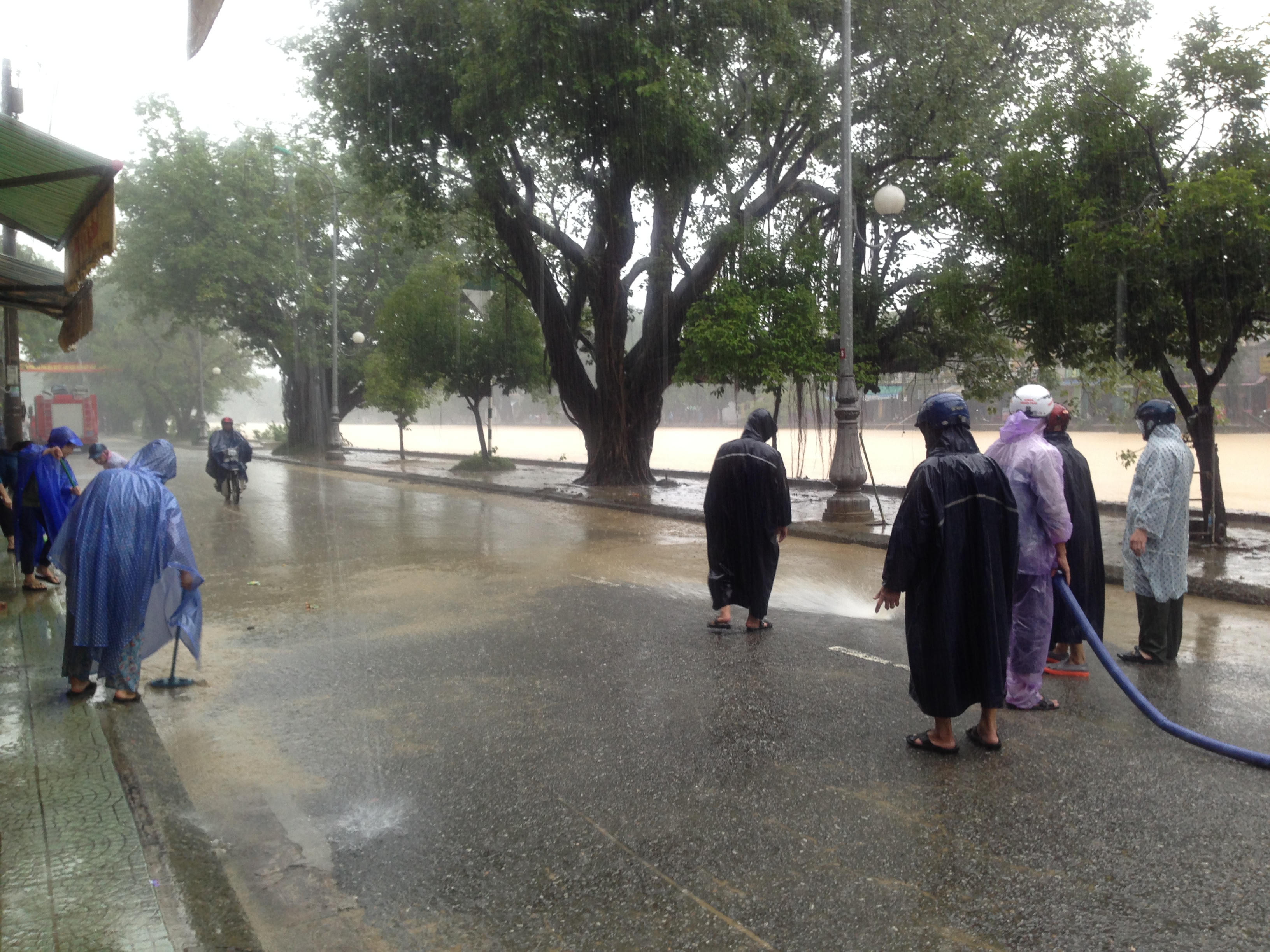Hoặc nếu muốn thu dọn bùn đất, phải xúc lên xe để vận chuyển đi đổ, rất mất công, tốn kém. Cho nên, dù biết trước được dự báo đến trưa 7/11, nước trên các sông bắt đầu lên lại, nhưng người dân vẫn hăng hái tích cực vệ sinh, xịt rửa đường sá, để sạch được chừng nào hay chừng đó.
