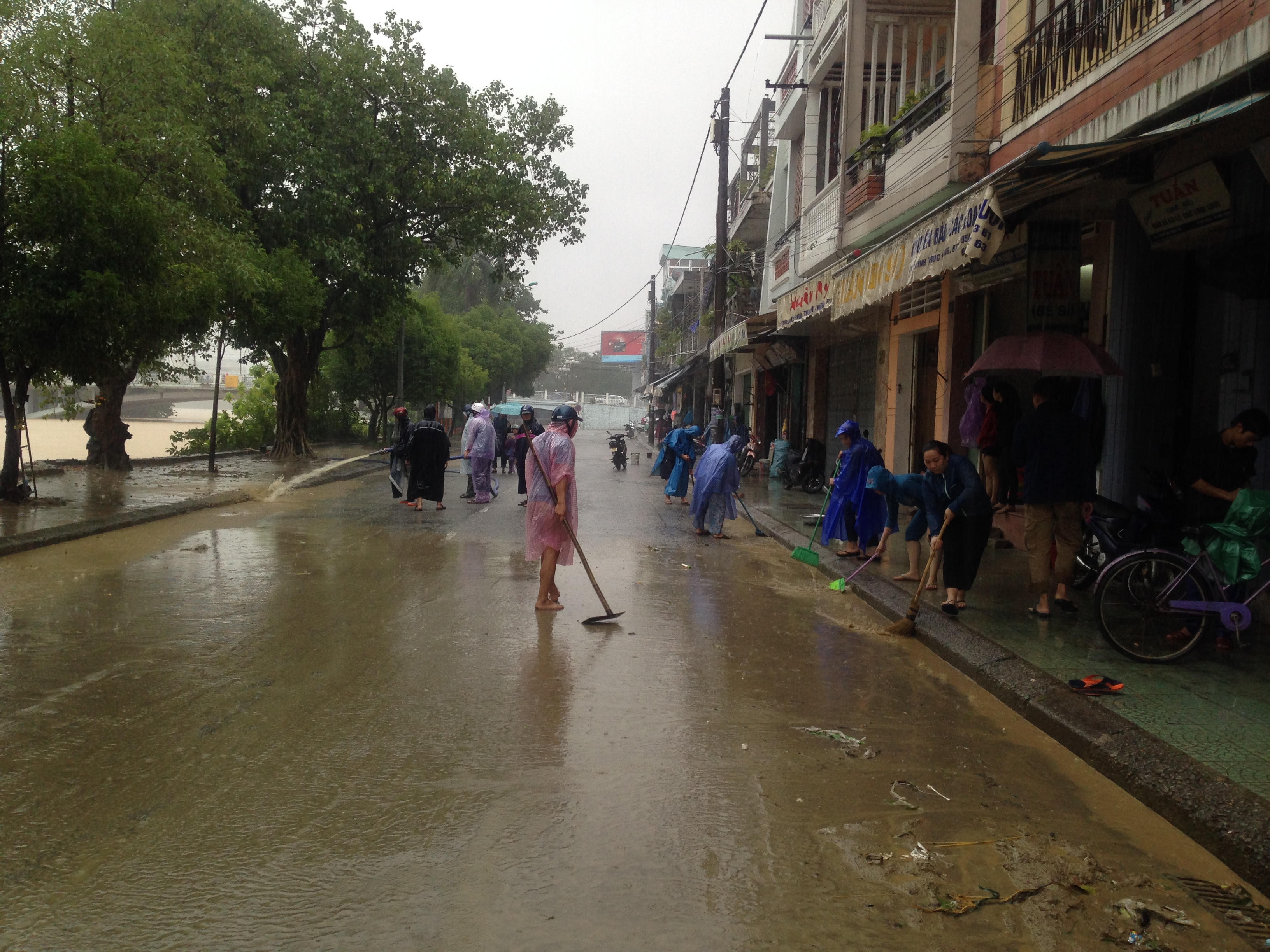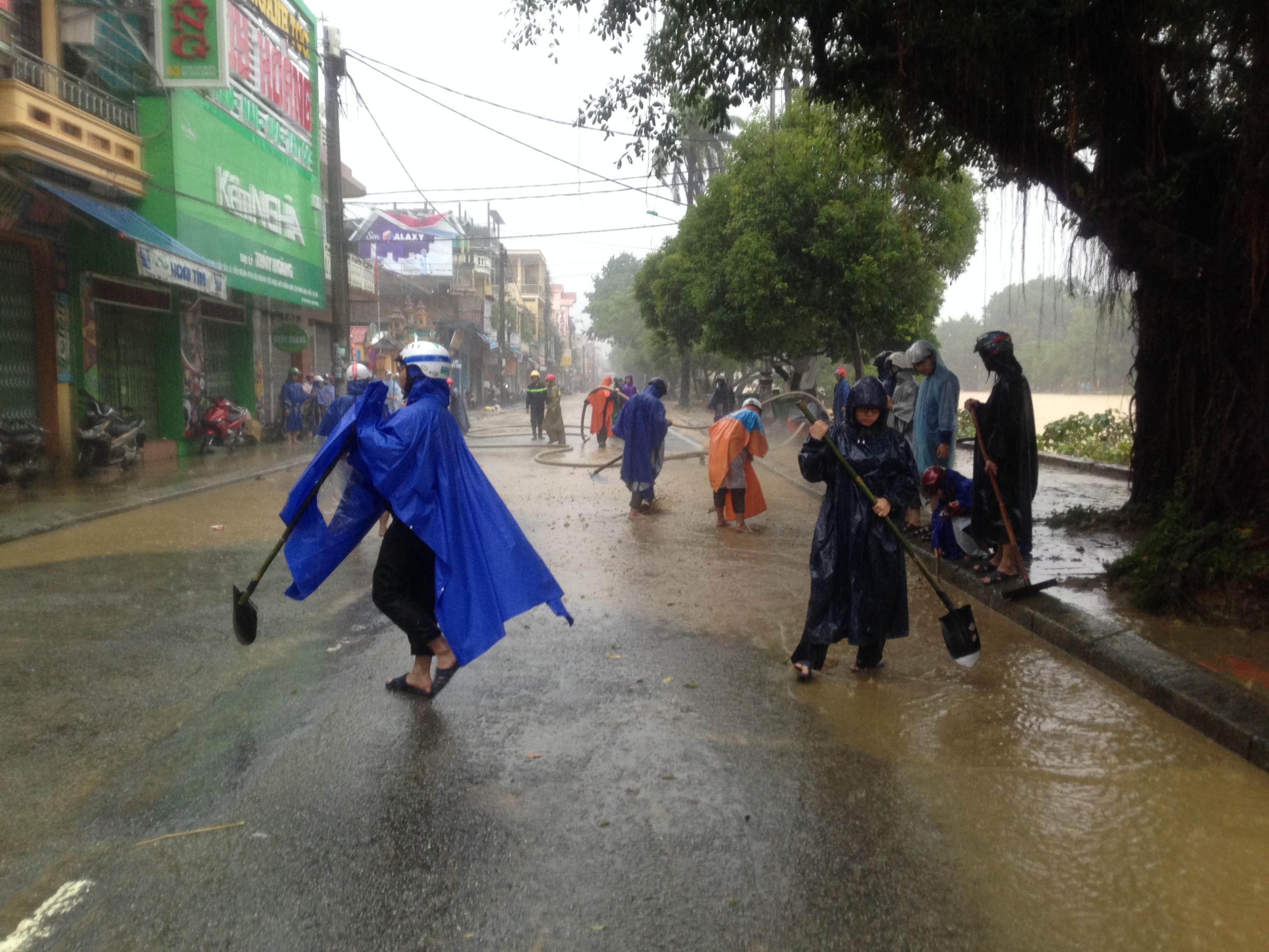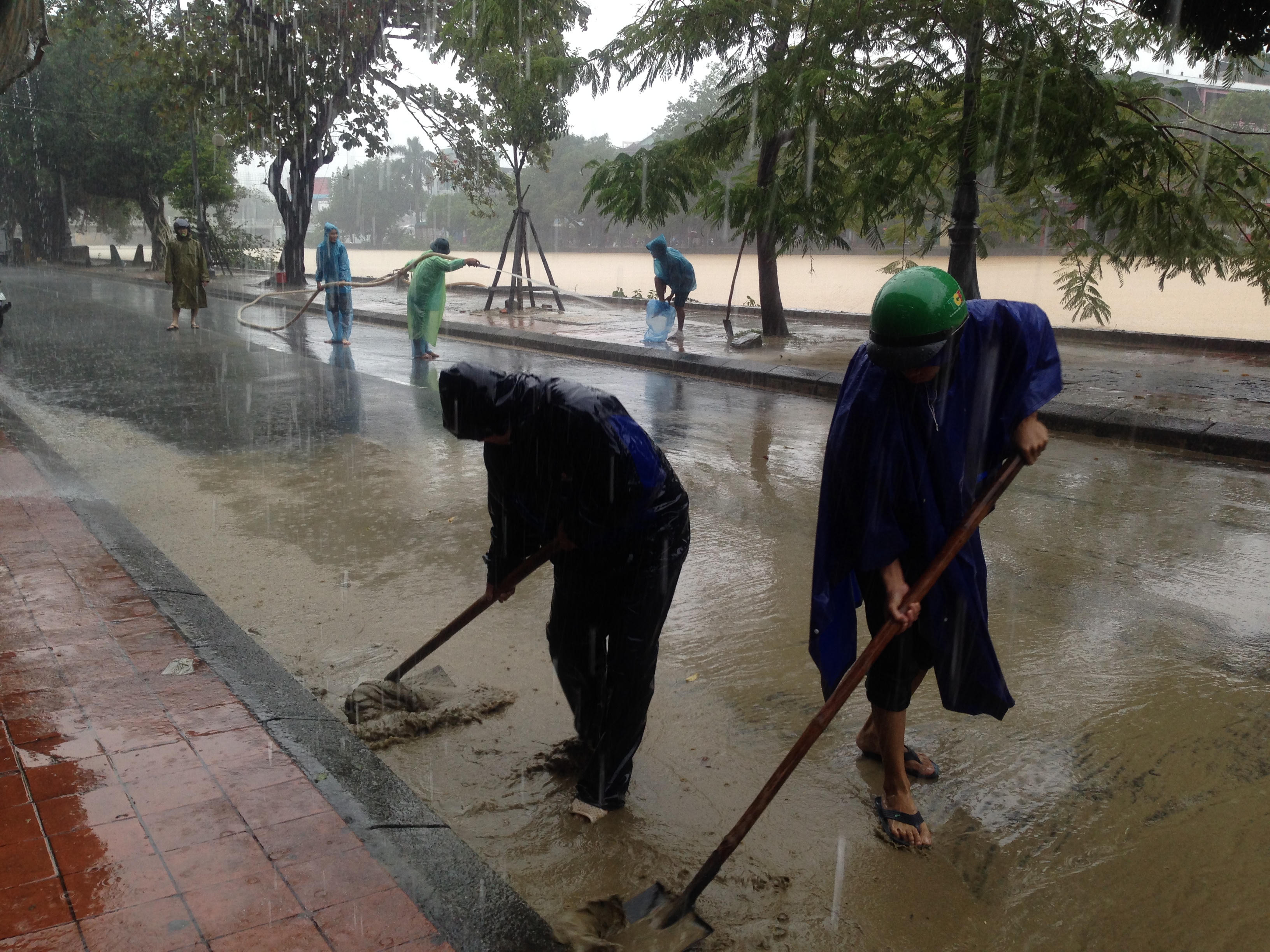 Ngay sau khi nước vừa rút trên một số tuyến đường, các phường Phú Hòa, Phú Cát đã huy động lực lượng thanh niên, dân quân tự vệ, công an phối hợp với lực lượng PCCC TT Huế, sử dụng các phương tiện xe chữa cháy, vòi xịt, cào, xẻng để ra quân dọn vệ sinh tại đường Huỳnh Thúc Kháng và Bạch Đằng nằm dọc sông Đông Ba là hai trong nhiều tuyến đường trọng điểm ngập lụt có lượng bùn non khá nhiều.