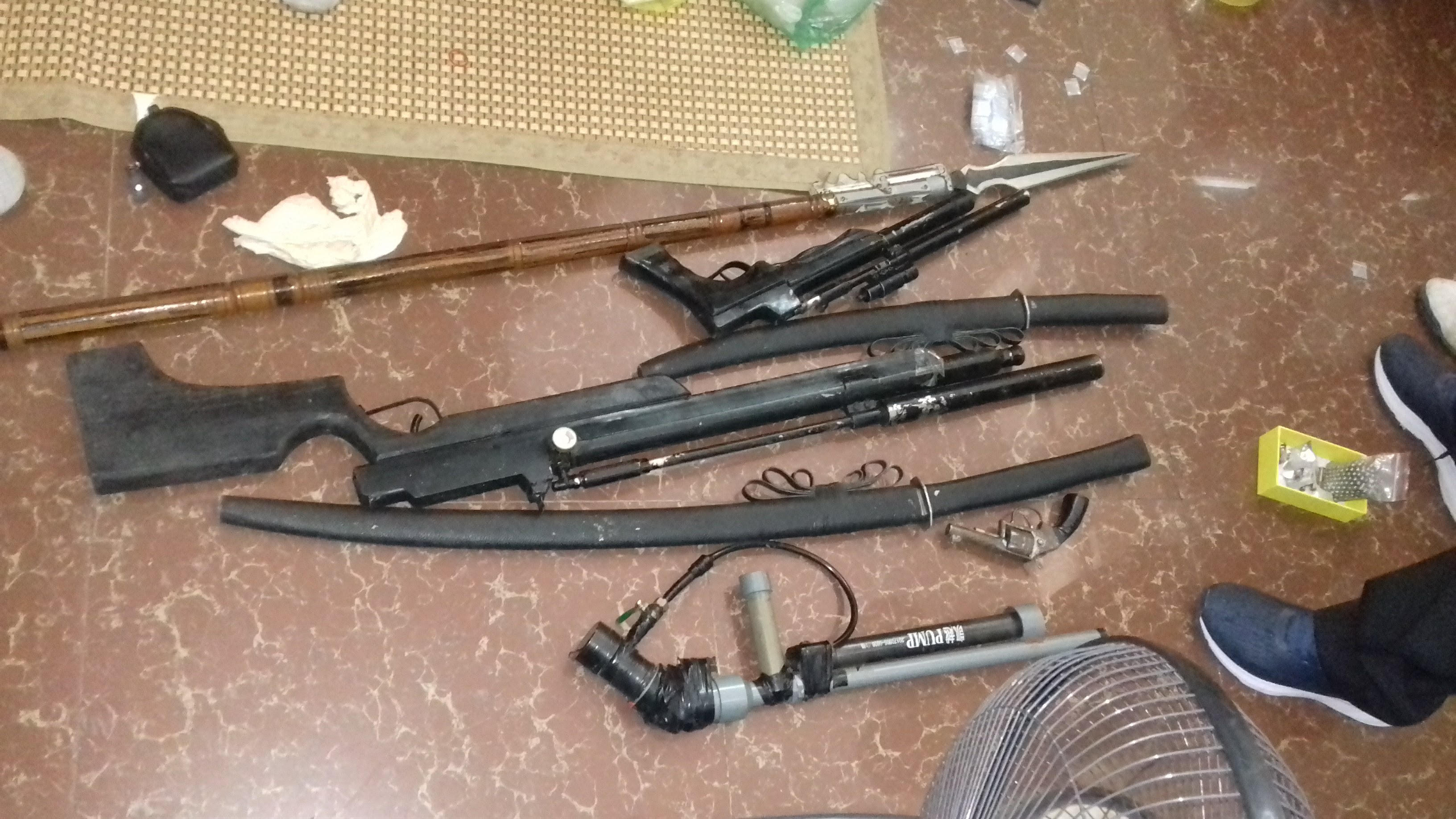 Ngoài ra, công an cũng thu giữ được thêm 03 khẩu súng tự chế bắn đạn bi sắt, 01 khẩu súng côn xoay tự chế bên trong có nạp 03 viên đạn chì (dạng đạn thể thao), 05 viên đạn kim loại, thân đạn màu vàng, đầu đạn màu xám, dài 3cm; 01 túi nilon bên trong chứa nhiều đạn kim loại (dạng bi sắt) và nhiều dao, kiếm.