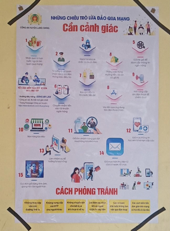 ![]() Áp phích cảnh báo phòng, chống tội phạm lừa đảo được dán ở các nhà văn hóa, khu vực công cộng. |