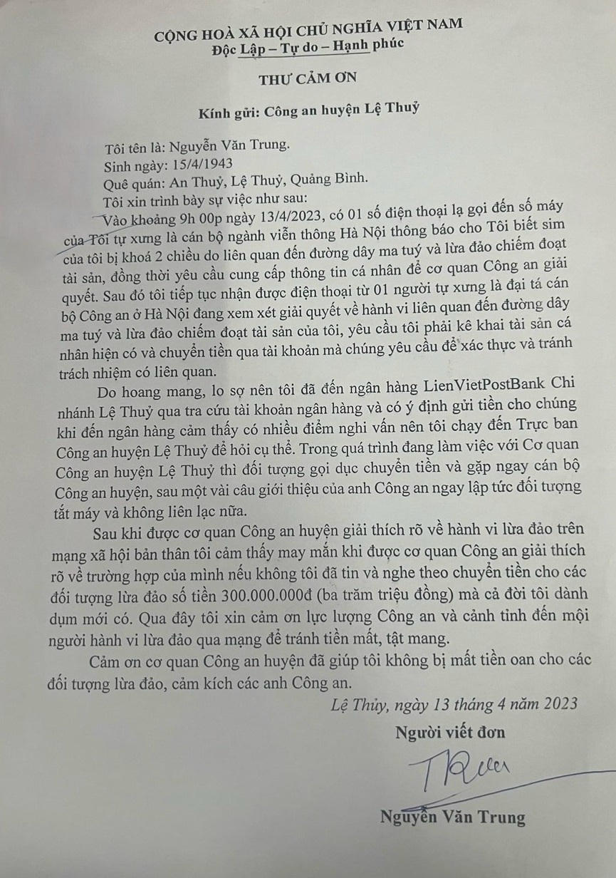 Cảm kích trước sự nhanh trí, kịp thời, ông Trung đã viết thư Cảm ơn lực lượng Công an huyện Lệ Thủy. |