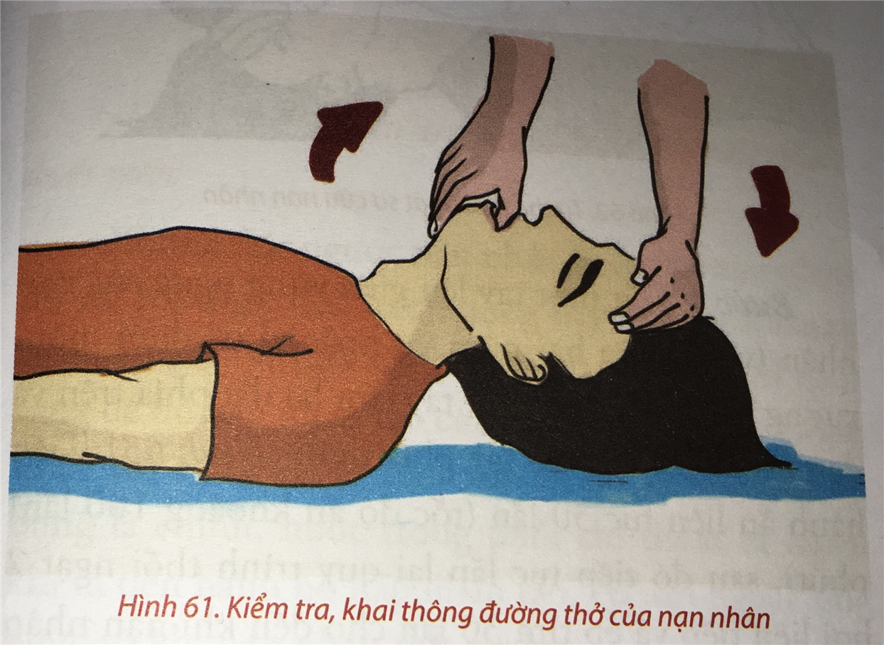 Bước 1: Khai thông đường thở và loại bỏ những dị vật trong miệng nạn nhân bằng cách đặt nghiêng đầu nạn nhân, sử dụng ngón tay lùa trong khoang miệng để loại bỏ các dị vật và đẩy bỏ đờm, dãi nhằm khai thông đường thở (Hình 61). Tiếp theo đặt thẳng đầu nạn nhân, một tay để lên trán và đẩy ra phía sau, một tay nâng cằm nạn nhân lên sao cho cổ được ưỡn tối đa.