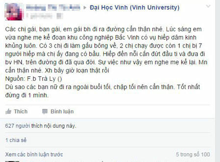 Một số trang facebook dẫn lại còn “hùng hồn” khẳng định tin chính xác 100%, một phụ nữ có thai bị hiếp dâm tập thể.