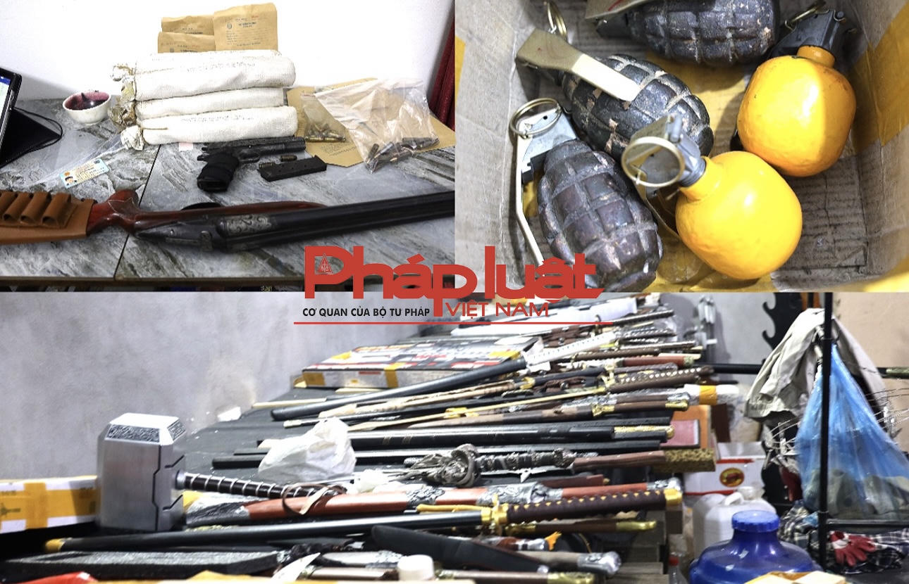 Vật chứng thu giữ: 01 khẩu súng quân dụng, 01 khẩu súng săn, 01 hộp tiếp đạn; 05 quả lựu đạn (chưa kiểm tra bên trong, đối tượng khai nhận dùng để trưng bày câu like và bán); 83 viên đạn các loại, 1.000 vỏ đạn, 34 kg đầu đạn, vỏ đạn các loại, 07 túi xác rắn đựng chất dẻo màu nâu có tổng trọng lượng 07 kg nghi là thuốc nổ và nhiều dụng cụ để chế tạo đạn (đối tượng khai nhận sử dụng vỏ đạn, thuốc nổ và các nguyên liệu trên để chế tạo đạn); 73 dao, kiếm các loại...