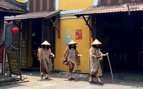 Trưa 31/3, một nhóm 4 người đội nón lá, ăn mặc rách rưới theo kiểu người hành khất mang theo gậy, bát đi một số tuyến đường trong khu phố cổ Hội An diễn trò ăn xin.