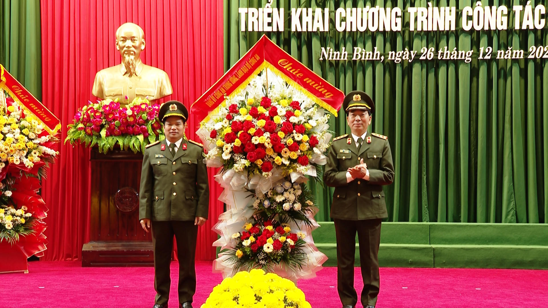 Thượng tướng Trần Quốc Tỏ - Thứ trưởng Bộ Công an tặng hoa chúc mừng Công an tỉnh Ninh Bình. |
