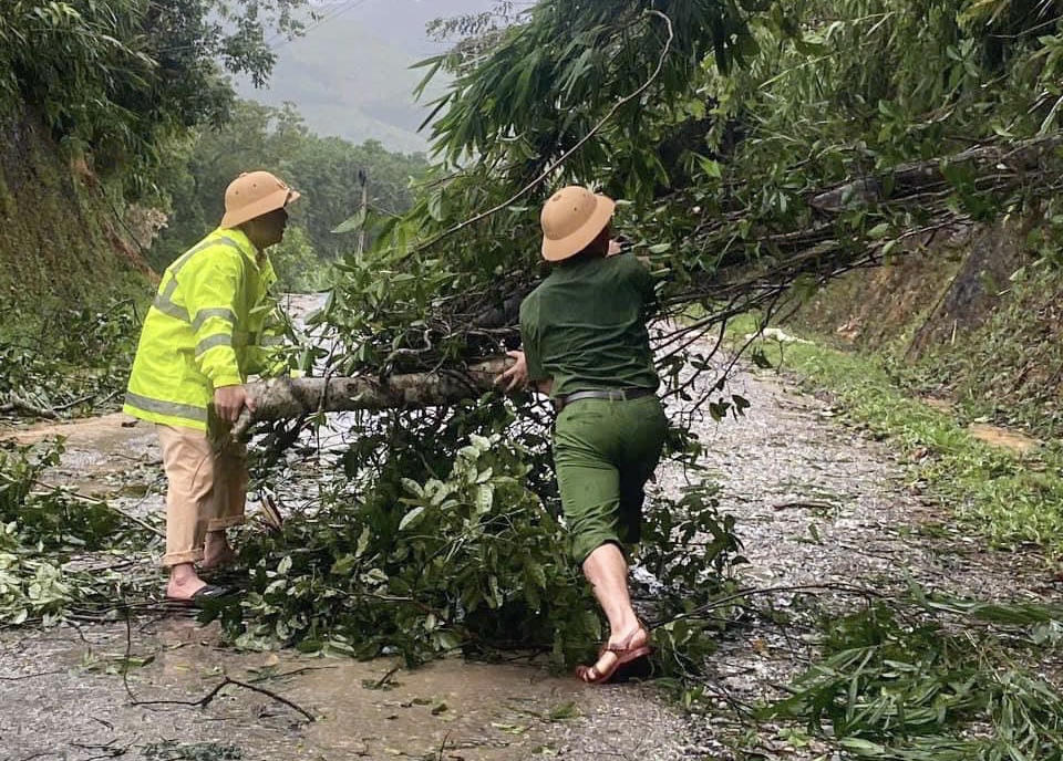 Cán bộ chiến sĩ công an giao thông huyện Chợ Mới (tỉnh Bắc Kạn) thu dọn cây cối bị gãy, đổ trên các tuyến đường giao thông. |
